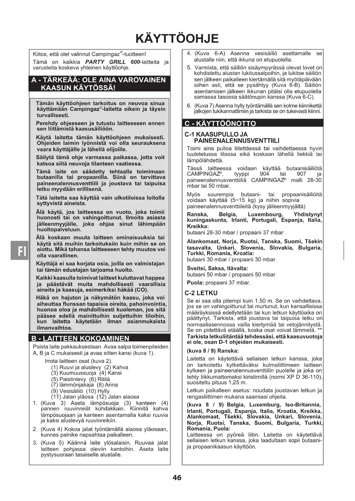 Poista laite pakkauksestaan. Avaa salpa toimenpiteiden A, B ja C mukaisesti ja avaa sitten kansi (kuva 1). Irrota laitteen osat (kuva 2).(1) Ruuvi ja aluslevy (2) Kahva(3) Kuumuussuoja (4) Kansi (5) Paistinlevy (6) Ritilä (7) lämmönjakaja (8) Arina (9) Vesisäiliö (10) Hylly(11) Jalan yläosa (12) Jalan alaosa1. (Kuva 3) Aseta lämpösuoja (3) kanteen (4) pannen ruuvinreiät kohdakkain. Kiinnitä kahva lämpösuojaan ja kanteen asentamalla kaksi ruuvia ja kaksi aluslevyä ruuvinreikiin. 2. (Kuva 4) Kokoa jalat työntämällä alaosa yläosaan, kunnes painike napsahtaa paikalleen.3. (Kuva 5) Käännä laite ylösalaisin. Ruuvaa jalat laitteen pohjassa oleviin kantoihin. Aseta laite pystysuoraan tasaiselle alustalle. 4. (Kuva 6-A) Asenna vesisäiliö asettamalle se alustalle niin, että ikkuna on etupuolella.5. Varmista, että säiliön sisäympyrässä olevat lovet on kohdistettu alustan lukitussalpoihin, ja lukitse säiliön sen jälkeen paikalleen kiertämällä sitä myötäpäivään siihen asti, että se pysähtyy (Kuva 6-B). Säiliön asentamisen jälkeen ikkunan pitäisi olla etupuolella samassa tasossa säätönupin kanssa (Kuva 6-C).6. (Kuva 7) Asenna hylly työntämällä sen kolme kiinnikettä jalkojen tukikannattimiin ja tarkista se on tukevasti kiinni. c - KÄYTTÖÖNOTTO c-1 KAASUPULLO JA PAINEENALENNUSVENTTIILI Toimi aina pulloa liitettäessä tai vaihdettaessa hyvin tuuletetussa tilassa eikä koskaan lähellä liekkiä tai lämpölähdettä. Tässä laitteessa voidaan käyttää butaanisäiliötä CAMPINGAZ , tyyppi 904 tai 907 ja paineenalennusventtiiliä CAMPINGAZ malli 28-30 mbar tai 50 mbar.Myös suurempia butaani- tai propaanisäiliöitä voidaan käyttää (5~15 kg) ja niihin sopivia paineenalennusventtiileitä (kysy jälleenmyyjältä)Ranska, Belgia, Luxembourg, Yhdistynyt kuningaskunta, Irlanti, Portugali, Espanja, Italia, Kreikka: butaani 28-30 mbar / propaani 37 mbarAlankomaat, Norja, Ruotsi, Tanska, Suomi, Tšekin tasavalta, Unkari, Slovenia, Slovakia, Bulgaria, Turkki, Romania, Kroatia:butaani 30 mbar / propaani 30 mbarSveitsi, Saksa, Itävalta:butaani 50 mbar / propaani 50 mbarPuola: propaani 37 mbar. c-2 LETKU Se ei saa olla pitempi kuin 1.50 m. Se on vaihdettava, jos se on vahingoittunut tai murtunut, kun kansallisissa määräyksissä edellytetään tai kun letkun käyttöaika on päättynyt. Tarkista, että joustava tai taipuisa letku on normaaliasennossa vailla kiertymää tai vetojännitystä. Se on pidettävä etäällä, koska osat voivat lämmetä. ** Tarkista letkuliitäntää tehdessäsi, että kaasuvuotoja ei ole, osan D-1 ohjeiden mukaisesti.(kuva 8 / 9) Ranska: Laitetta on käytettävä sellaisen letkun kanssa, joka on tarkoitettu kytkettäväksi kulmaliittimeen laitteen kylkeen ja paineenalennusventtiilin puolelle ja joka on tehty liikkumattomaksi kiristimillä (normi XP D 36-110), suositeltu pituus 1,25 m.Letkun paikalleen asetus: noudata joustavan letkun ja rengasliittimen mukana saamiasi ohjeita. (kuva 8 / 9) Belgia, Luxemburg, Iso-Britannia, Irlanti, Portugali, Espanja, Italia, Kroatia, Kreikka, Alankomaat, Tšekki, Slovakia, Unkari, Slovenia, Norja, Ruotsi, Tanska, Suomi, Bulgaria, Turkki, Romania, Puola:Laitteessa on pyöreä liitin. Laitetta on käytettävä sellaisen letkun kanssa, joka laadultaan sopii butaani- ja propaanikaasun käyttöön.
