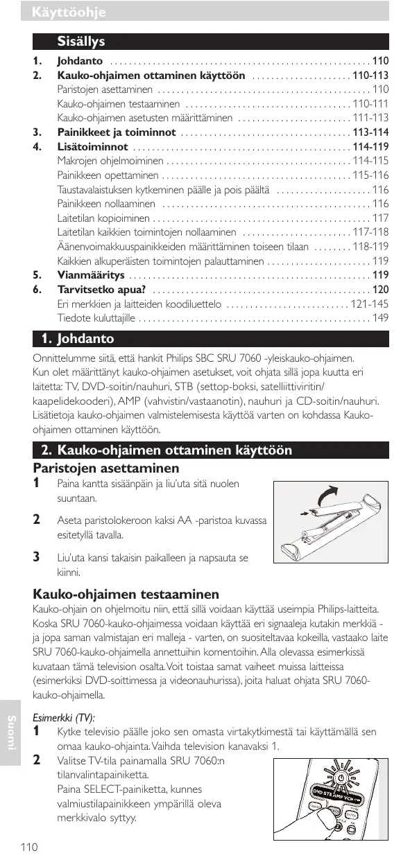 Onnittelumme siitä, että hankit Philips SBC SRU 7060 -yleiskauko-ohjaimen. Kun olet määrittänyt kauko-ohjaimen asetukset, voit ohjata sillä jopa kuutta eri laitetta: TV, DVD-soitin/nauhuri, STB (settop-boksi, satelliittiviritin/ kaapelidekooderi), AMP (vahvistin/vastaanotin), nauhuri ja CD-soitin/nauhuri. Lisätietoja kauko-ohjaimen valmistelemisesta käyttöä varten on kohdassa Kaukoohjaimen ottaminen käyttöön.