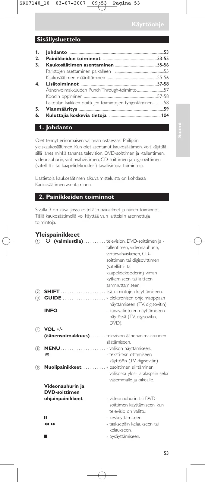 SRU7140_10 03-07-2007 09:53 Pagina 53 Käyttöohje Sisällysluettelo