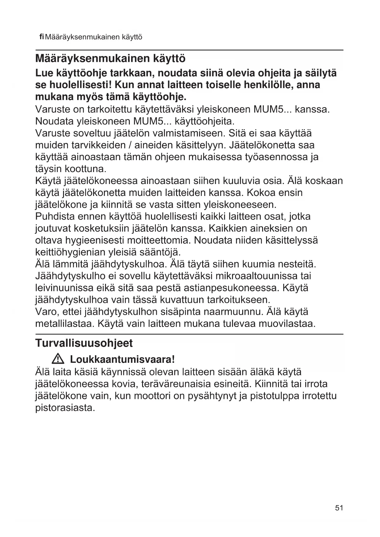 Määräyksenmukainen käyttö Määräyksenmukainen käyttö Lue käyttöohje tarkkaan, noudata siinä olevia ohjeita ja säilytä se huolellisesti! Kun annat laitteen toiselle henkilölle, anna mukana myös tämä käyttöohje. Varuste on tarkoitettu käytettäväksi yleiskoneen MUM5... kanssa. Noudata yleiskoneen MUM5... käyttöohjeita. Varuste soveltuu jäätelön valmistamiseen. Sitä ei saa käyttää muiden tarvikkeiden / aineiden käsittelyyn. Jäätelökonetta saa käyttää ainoastaan tämän ohjeen mukaisessa työasennossa ja täysin koottuna. Käytä jäätelökoneessa ainoastaan siihen kuuluvia osia. Älä koskaan käytä jäätelökonetta muiden laitteiden kanssa. Kokoa ensin jäätelökone ja kiinnitä se vasta sitten yleiskoneeseen. Puhdista ennen käyttöä huolellisesti kaikki laitteen osat, jotka joutuvat kosketuksiin jäätelön kanssa. Kaikkien aineksien on oltava hygieenisesti moitteettomia. Noudata niiden käsittelyssä keittiöhygienian yleisiä sääntöjä. Älä lämmitä jäähdytyskulhoa. Älä täytä siihen kuumia nesteitä. Jäähdytyskulho ei sovellu käytettäväksi mikroaaltouunissa tai leivinuunissa eikä sitä saa pestä astianpesukoneessa. Käytä jäähdytyskulhoa vain tässä kuvattuun tarkoitukseen. Varo, ettei jäähdytyskulhon sisäpinta naarmuunnu. Älä käytä metallilastaa. Käytä vain laitteen mukana tulevaa muovilastaa. Turvallisuusohjeet W Loukkaantumisvaara! Älä laita käsiä käynnissä olevan laitteen sisään äläkä käytä jäätelökoneessa kovia, teräväreunaisia esineitä. Kiinnitä tai irrota jäätelökone vain, kun moottori on pysähtynyt ja pistotulppa irrotettu pistorasiasta.52 Yhdellä silmäyksellä Valmistelut Jäätelökoneen jäähdyttäminen Huomio! Jäähdytyskulho on puhdistettava perusteel- lisesti jäätelön valmistusta varten. X Kuvasarja B