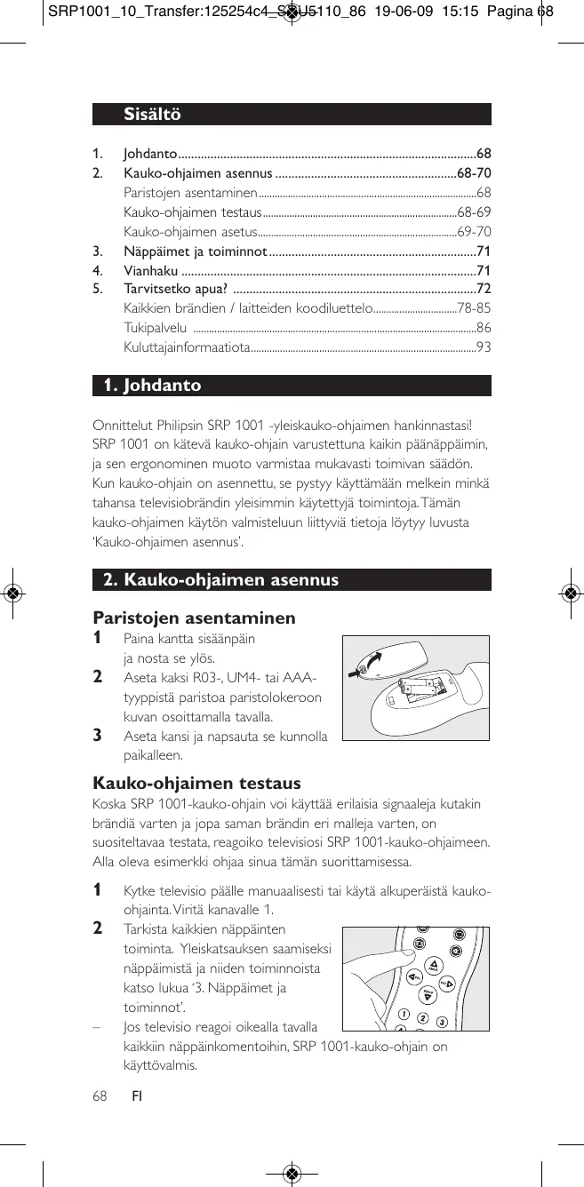 Johdanto68 Kauko-ohjaimen asennus 68-70 Paristojen asentaminen68 Kauko-ohjaimen testaus68-69 Kauko-ohjaimen asetus69-70 Näppäimet ja toiminnot 71 Vianhaku 71 Tarvitsetko apua? 72 Kaikkien brändien / laitteiden koodiluettelo78-85 Tukipalvelu 86 Kuluttajainformaatiota93