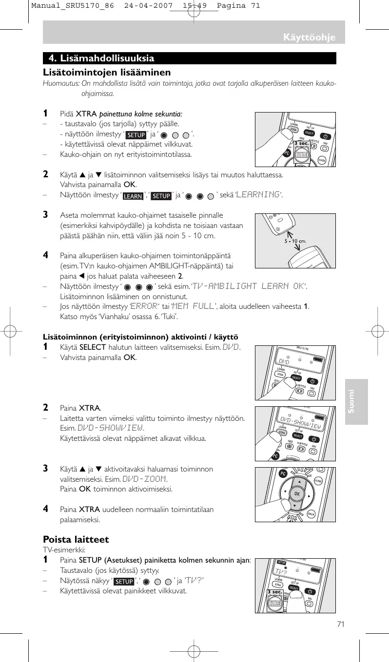 Siirry luettelon alareunassa olevaan ’DELETE TV’ (Poista TV) -kohtaan ylä- tai alanuolella. Poista TV-laitteen toimintatila painamalla OK-painiketta. Näytössä näkyy teksti ’DEVICE DELETED’ (Laite poistettu). TV-laitteen toimintatila on poistettu. Toimintojen oppiminen Jos alkuperäisestä kauko-ohjaimestasi SRU 5170:llä puuttuu tiettyjä toimintoja, se pystyy oppimaan nämä toiminnot alkuperäisestä kauko-ohjaimesta.Voit tallentaa toiminnon SRU 5170:n mihin tahansa tarjolla oleviin näppäimiin paitsi XTRA (LEARN) ja SELECT (SETUP). Näppäimeen aikaisemmin tallennettu toiminto pyyhkiytyy yli. Suomi
