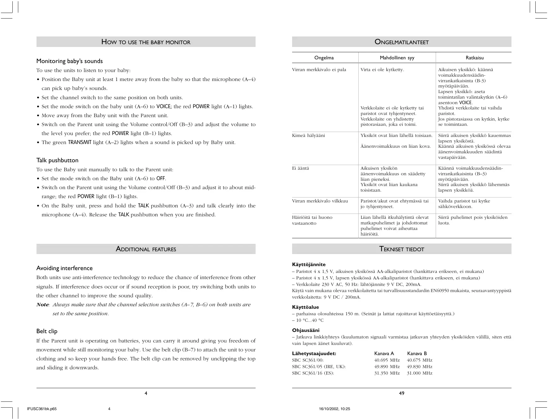 - Paina lapsen yksikön TALK-painiketta (A–3) ja puhu selvästi mikrofoniin (A–4). Vapauta TALK-painike, kun olet puhunut. MUUT TECHNICAL SPECIFICATIONS OMINAISUUDET Power supply Häiriönesto Molemmissa yksiköissä on käytetty häiriönestotekniikkaa, jolla vähennetään mahdollisia muiden signaalien aiheuttamia häiriöitä. Jos häiriöitä esiintyy tai äänen vastaanotto on heikkoa, kokeile paraneeko äänen laatu, jos kytket molemmat yksiköt toiselle kanavalle. Huom:Varmista aina, että kummankin yksikön kanavanvalintakytkin (A–7, B–6) on samassa asennossa. – Optional batteries 4 x 1.5V; AA alkaline for Parent Unit (not included); – Optional batteries 4 x 1.5V; AA alkaline for Baby Unit (not included); – AC power adapter 230V AC, 50 Hz (1 included): - Output voltage 9V DC, 200mA. Only use the AC power adapter included or a type that complies with safety standard EN60950 and that has the following specification: 9 Volt DC / 200mA. Operating range – up to 150 metres in ideal conditions (walls and floors can limit this distance). – 10°C to 40°Cs Vyöpidike Pilot tone Kun aikuisen yksikköä käytetään paristoilla, voit kuljettaa yksikköä mukanasi ja seurata – Continuous communication link (hidden signal ensures a continuous link between both units so you only hear your baby’s sounds). samalla lapsen ääntelyä. Yksikön voi kiinnittää vyöpidikkeellä (B–7) vaatetukseen, jolloin kädet jäävät vapaiksi. Vyöpidike voidaan irrottaa napsauttamalla yläosa irti ja työntämällä se alas. Transmission frequencies Channel A Channel B SBC SC361/00: SBC SC361/05 (IRE, UK): SBC SC361/16 (ES):
