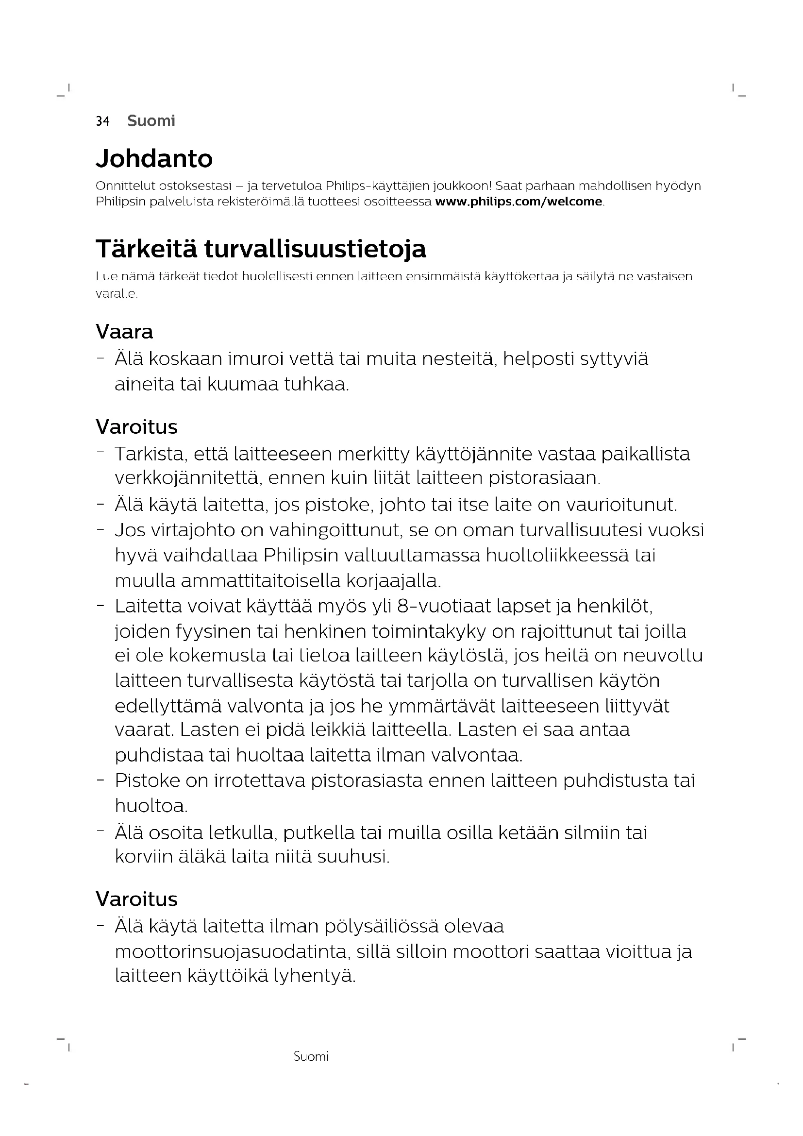 PortuguêsSuomi Johdanto Onnittelut ostoksestasi – ja tervetuloa Philips-käyttäjien joukkoon! Saat parhaan mahdollisen hyödynPhilipsin palveluista rekisteröimällä tuotteesi osoitteessa www.philips.com/welcome. Tärkeitä turvallisuustietoja Lue nämä tärkeät tiedot huolellisesti ennen laitteen ensimmäistä käyttökertaa ja säilytä ne vastaisenvaralle. Vaara