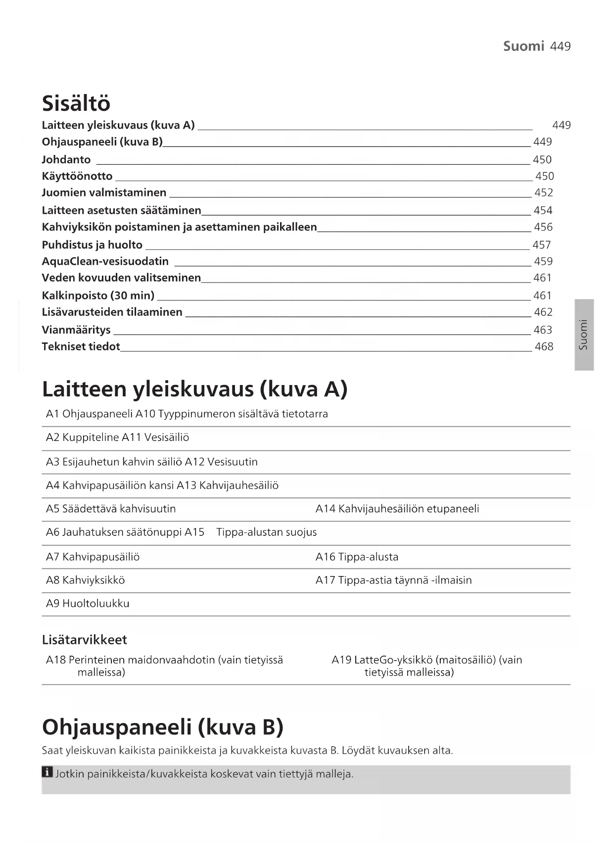 Suomi SuomiSuomi Sisältö Laitteen yleiskuvaus (kuva A) _____________________________________________________________ 449 Ohjauspaneeli (kuva B)___________________________________________________________________ 449Johdanto _______________________________________________________________________________ 450Käyttöönotto ____________________________________________________________________________ 450Juomien valmistaminen __________________________________________________________________ 452Laitteen asetusten säätäminen____________________________________________________________ 454Kahviyksikön poistaminen ja asettaminen paikalleen_______________________________________ 456Puhdistus ja huolto ______________________________________________________________________ 457AquaClean-vesisuodatin _________________________________________________________________ 459Veden kovuuden valitseminen____________________________________________________________ 461Kalkinpoisto (30 min) ____________________________________________________________________ 461Lisävarusteiden tilaaminen _______________________________________________________________ 462Vianmääritys ____________________________________________________________________________ 463Tekniset tiedot___________________________________________________________________________ 468 Laitteen yleiskuvaus (kuva A) A1 Ohjauspaneeli A10 Tyyppinumeron sisältävä tietotarraA2 Kuppiteline A11 VesisäiliöA3 Esijauhetun kahvin säiliö A12 VesisuutinA4 Kahvipapusäiliön kansi A13 KahvijauhesäiliöA5 Säädettävä kahvisuutin A14 Kahvijauhesäiliön etupaneeliA6 Jauhatuksen säätönuppi A15 Tippa-alustan suojusA7 Kahvipapusäiliö A16 Tippa-alustaA8 Kahviyksikkö A17 Tippa-astia täynnä -ilmaisinA9 Huoltoluukku Lisätarvikkeet A18 Perinteinen maidonvaahdotin (vain tietyissämalleissa)A19 LatteGo-yksikkö (maitosäiliö) (vaintietyissä malleissa) Ohjauspaneeli (kuva B) Saat yleiskuvan kaikista painikkeista ja kuvakkeista kuvasta B. Löydät kuvauksen alta. Jotkin painikkeista/kuvakkeista koskevat vain tiettyjä malleja.450 Suomi B1 Virtapainike B7 Varoituskuvakkeet B2 Juomakuvakkeet* B8 Aloituksen merkkivalo B3 Kahvin vahvuus / esijauhetun kahvin kuvake B9 Käynnistys- painike B4 Juoman määrän kuvake B10 Calc / Clean -kuvake B5 Maidon määrän kuvake (vain tietyissä malleissa) B11 AquaClean-kuvake B6 Kahvin lämpötilan kuvake (vain tietyissä malleissa)