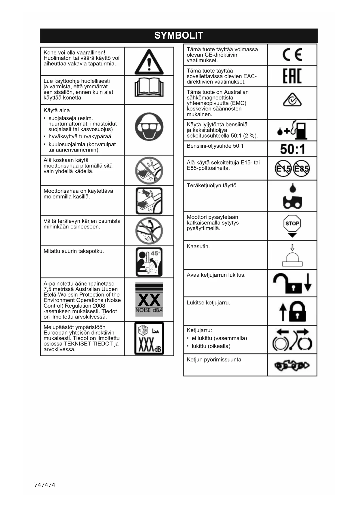 Melupäästöt ympäristöön Euroopan yhteisön direktiivin mukaisesti. Tiedot on ilmoitettu osiossa TEKNISET TIEDOT ja arvokilvessä. Tämä tuote täyttää voimassa olevan CE-direktiivin vaatimukset. Tämä tuote täyttää sovellettavissa olevien EAC- direktiivien vaatimukset. Tämä tuote on Australian sähkömagneettista yhteensopivuutta (EMC) koskevien säännösten mukainen. Käytä lyijytöntä bensiiniä ja kaksitahtiöljyä sekoitussuhteella 50:1 (2 %). Bensiini-öljysuhde 50:1 Älä käytä sekoitettuja E15- tai E85-polttoaineita. Teräketjuöljyn täyttö. Moottori pysäytetään katkaisemalla sytytys pysäyttimellä. Kaasutin. Avaa ketjujarrun lukitus. Lukitse ketjujarru. Ketjujarru: