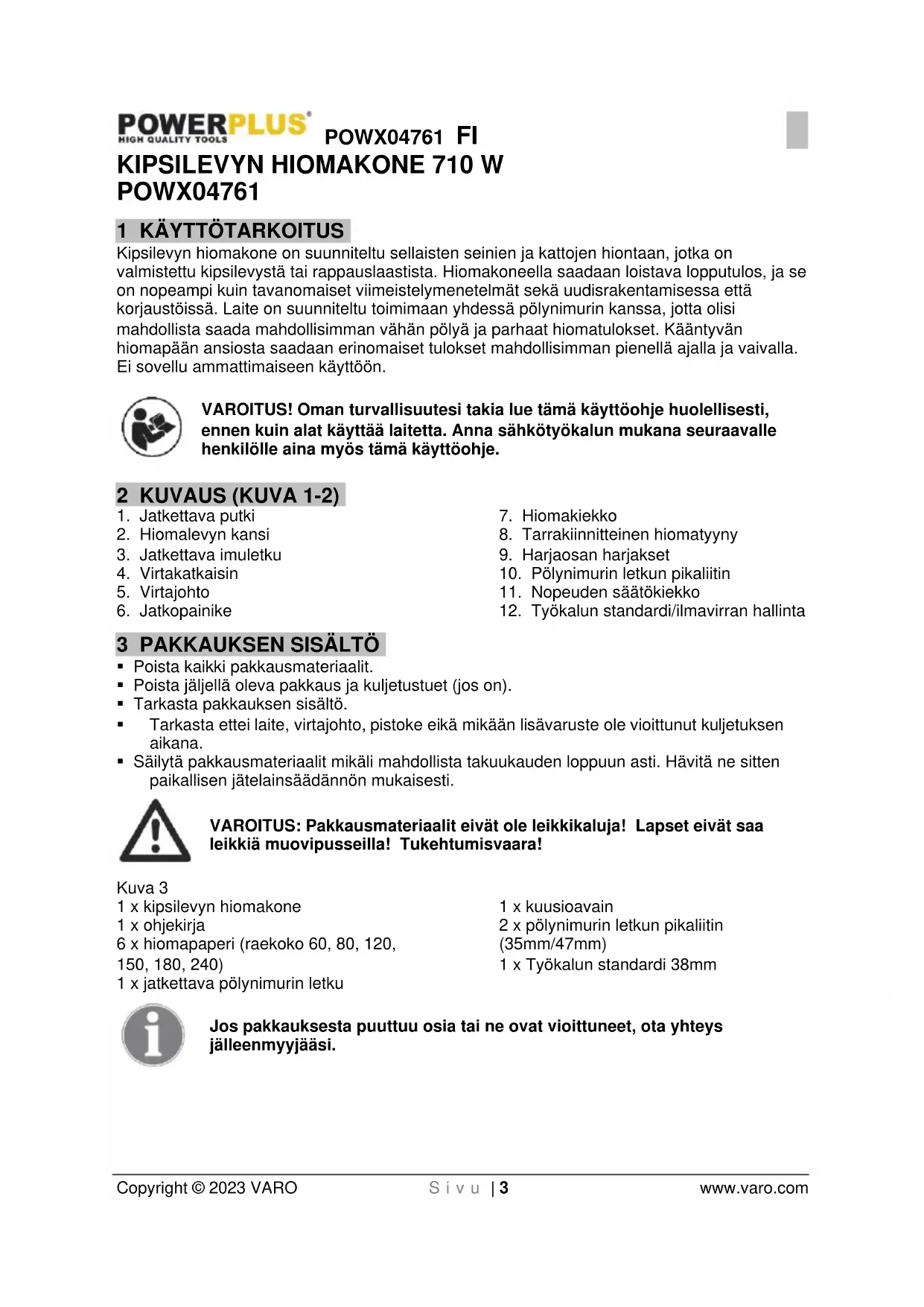 - Säilytä pakkausmateriaalit mikäli mahdollista takuukauden loppuun asti. Hävitä ne sitten paikallisen jätelainsäädännön mukaisesti. VAROITUS: Pakkausmateriaalit eivät ole leikkikaluja! Lapset eivät saa leikkiä muovipusseilla! Tukehtumisvaara! Kuva 3 1 x kipsilevyn hiomakone 1 x ohjekirja 6 x hiomapaperi (raekoko 60, 80, 120, 150, 180, 240) 1 x jatkettava pölynimurin letku 1 x kuusioavain 2 x pölynimurin letkun pikaliitin (35mm/47mm) 1 x Työkalun standardi 38mm Jos pakkauksesta puuttuu osia tai ne ovat vioittuneet, ota yhteys jälleenmyyjääsi.POWX04761 FI Copyright © 2023 VARO S i v u | 4 www.varo.com 4 SYMBOLIT Seuraavia symboleja käytetään tässä ohjekirjassa ja/tai koneen päällä: