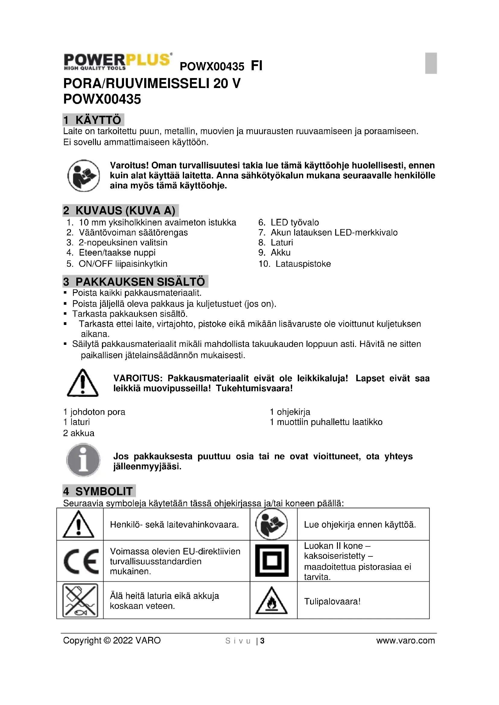 - Irrota säätötyökalut ja ruuvitaltat, ennen kuin kytket laitteen päälle. Työkalu tai ruuvitaltta voi aiheuttaa tapaturmia ollessaan kiinnitettynä pyörivään laitteen osaan.POWX00435 FI Copyright © 2022 VARO S i v u | 5 www.varo.com