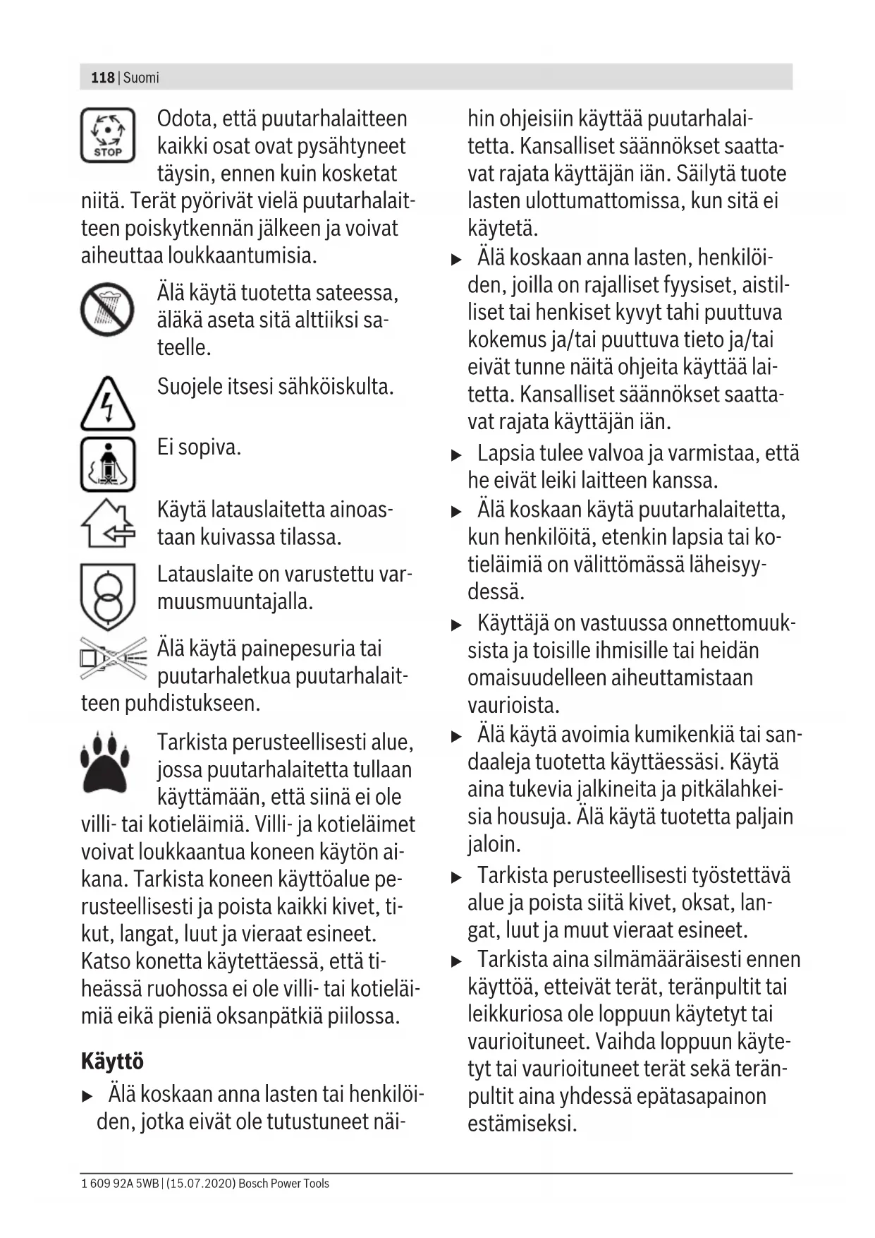 For å forlenge driftstiden kan du kjøpe et ekstra batteri hos et autorisert kundeservice for Bosch hageredskaper. Feilsøking Bosch Power Tools 1 609 92A 5WB | (15.07.2020)116 | Norsk Symptom Mulig årsak Løsning Motoren starter ikke Interne kabelforbindelser i hageredskapet er defekt Ta kontakt med Bosch kundeservice Utladet batteri Lad batteriet For kaldt/varmt batteri Varm opp/avkjøl batteriet For høyt gress Max. tillatt gresshøyde er 30 cm med den største innstillingen av klippehøyden Motorvernet er utløst La motoren avkjøle og innstill større klippehøyder Skillebryteren er ikke satt riktig/ikke komplett inn Sett den riktig inn Hageredskapet går rykkvis Interne kabelforbindelser i hageredskapet er defekt Ta kontakt med Bosch kundeservice Motorvernet er utløst La motoren avkjøle og innstill større klippehøyder Hageredskap etterlater et uregelmessig klippemønster og/eller motor arbeider tungt For liten klippehøyde Innstill en høyere klippehøyde Kniven er butt Skift ut kniv (se bilde K) Tetting mulig Slå av hageredskap og ta av skillebryter Sjekk hageredskapets underside og gjør den fri om nødvendig (bruk alltid arbeidshansker) Kniven er galt montert Monter kniven riktig Etter innkobling av hageredskapet dreier kniven seg ikke Knivene blokkeres av gress Slå av hageredskap og ta av strømkretsbryter Fjern tettingen (bruk alltid arbeidshansker) Løs knivmutter/-skrue Trekk fast knivmutter/-skrue (27Nm) Sterke vibrasjoner/ lyder Løs knivmutter/-skrue Trekk fast knivmutter/-skrue (27Nm) Skadet kniv Skift ut kniv (se bilde K) Batteri og ladeapparat Symptomer Mulig årsak Avhjelp Rød batteri- ladeindikator blinker Ingen opplading mulig Batteriet er ikke satt (riktig) inn Sett batteri riktig på ladeapparatet Batterikontaktene er tilsmusset Rengjør batterikontaktene; f.eks. ved hyppig innsetting og fjerning av batteriet, skift eventuelt ut batteriet Batteriet er defekt Skift ut batteriet Batteri-ladeindikatorer lyser ikke på ladeapparatet Strømstøpselet til ladeapparatet er ikke satt (riktig) inn Sett strømstøpselet (helt) inn i stikkontakten Stikkontakt, strømledning eller ladeapparat er defekt Sjekk strømspenningen, la ladeapparatet eventuelt kontrolleres av en autorisert kundeservice for Bosch-elektroverktøy Service og vedlikehold Stell av batteriet u OBS! Slå av hageredskapet, ta av skillebryteren og fjern batteriet samt gressoppsamleren før du utfører vedlikeholds- og rengjøringsarbeider. u Bruk alltid arbeidshansker når du håndterer eller arbeider i nærheten av de skarpe knivene. For å sikre en optimal bruk av batteriet, må du ta hensyn til følgende informasjoner og tiltak: – Beskytt batteriet mot fuktighet og vann. – Lagre hageredskapet og batteriet kun i temperaturområdet fra –20 °C og 50 °C. La hageredskapet f. eks. om sommeren ikke ligge i bilen. – Lagre batteri separat og ikke i hageredskapet. – Ikke la batteriet stå i hageredskapet ved direkte sol. – Den optimale temperaturen for oppbevaring av batteriet er 5 °C. – Rengjør ventilasjonssprekkene på batteriet regelmessig med en myk, ren og tørr pensel. En vesentlig kortere driftstid etter opplading er et tegn på at batteriet er oppbrukt og må skiftes ut. 1 609 92A 5WB | (15.07.2020) Bosch Power ToolsSuomi | 117 Kundeservice og kundeveiledning Kundeservice hjelper deg ved spørsmål om reparasjon og vedlikehold av produktet ditt og reservedelene. Du finner også sprengskisser og informasjon om reservedeler på www.bosch-pt.com Boschs kundeveilederteam hjelper deg gjerne hvis du har spørsmål om våre produkter og tilbehør. Ved alle forespørsler og reservedelsbestillinger må du oppgi det 10‑sifrede produktnummeret som er angitt på produktets typeskilt. Norsk Robert Bosch AS Postboks 350 1402 Ski Tel.: 64 87 89 50 Faks: 64 87 89 55 Du finner adresser til andre verksteder på: www.bosch-pt.com/serviceaddresses Transport Li-ion-batteriene i verktøyet underligger kravene for farlig gods. Batteriene kan transporteres på veier av brukeren uten ytterligere krav. Ved forsendelse som utføres av tredje personer (f.eks.: lufttransport eller spedisjon) må det oppfylles spesielle krav til emballasje og merking. Du må da konsultere en ekspert for farlig gods ved forberedelse av forsendelsen. Send batterier kun hvis huset ikke er skadet. Lim igjen de åpne kontaktene og pakk batteriet slik at det ikke beveger seg i emballasjen. Følg også eventuelle ytterligere nasjonale forskrifter. Deponering Hageredskaper, batterier, tilbehør og emballasje må leveres inn til miljøvennlig gjenvinning. Hagredskaper og batterier må ikke kastes i vanlig søppel! Kun for EU‑land: Iht. det europeiske direktivet 2012/19/EU om gamle elektriske og elektroniske maskiner og iht. det europeiske direktivet 2006/66/EF må defekte eller oppbrukte batterier/oppladbare batterier samles inn adskilt og leveres inn til en miljøvennlig resirkulering. Batterier/oppladbare batterier: Li-Ion: Ta hensyn til informasjonene i avsnittet Transport. Suomi Turvallisuusohjeita Huomio! Lue seuraavat ohjeet tar- kasti. Tutustu tuotteen käyttöele- mentteihin ja asianmukaiseen käyt- töön. Säilytä käyttöohje huolellisesti myöhempää käyttöä varten. Puutarhalaitteessa olevien tunnuskuvien selitykset Yleiset varoitusohjeet. Lue käyttöohje huolellisesti. Varmista, että sivulle sinkou- tuvat vieraat esineet eivät loukkaa lähellä seisovia ihmi- siä. Varoitus: Pidä turvallinen etäi- syys tuotteeseen sen ollessa toiminnassa. Varoitus: Älä koskaan kosketa pyöriviä teriä. Terät ovat terä- viä. Suojele varpaat ja sor- met, jotta et menettäisi niitä. Ennen puutarhalaitteen sää- töä tai puhdistusta, kun johto on juuttunut kiinni tai kun jä- tät puutarhalaitteen vaikka vain ly- hyeksi aikaa ilman valvontaa, tulee se pysäyttää, ja virtapiirin katkaisin irrot- taa. Ei sopiva. Bosch Power Tools 1 609 92A 5WB | (15.07.2020)118 | Suomi Odota, että puutarhalaitteen kaikki osat ovat pysäh