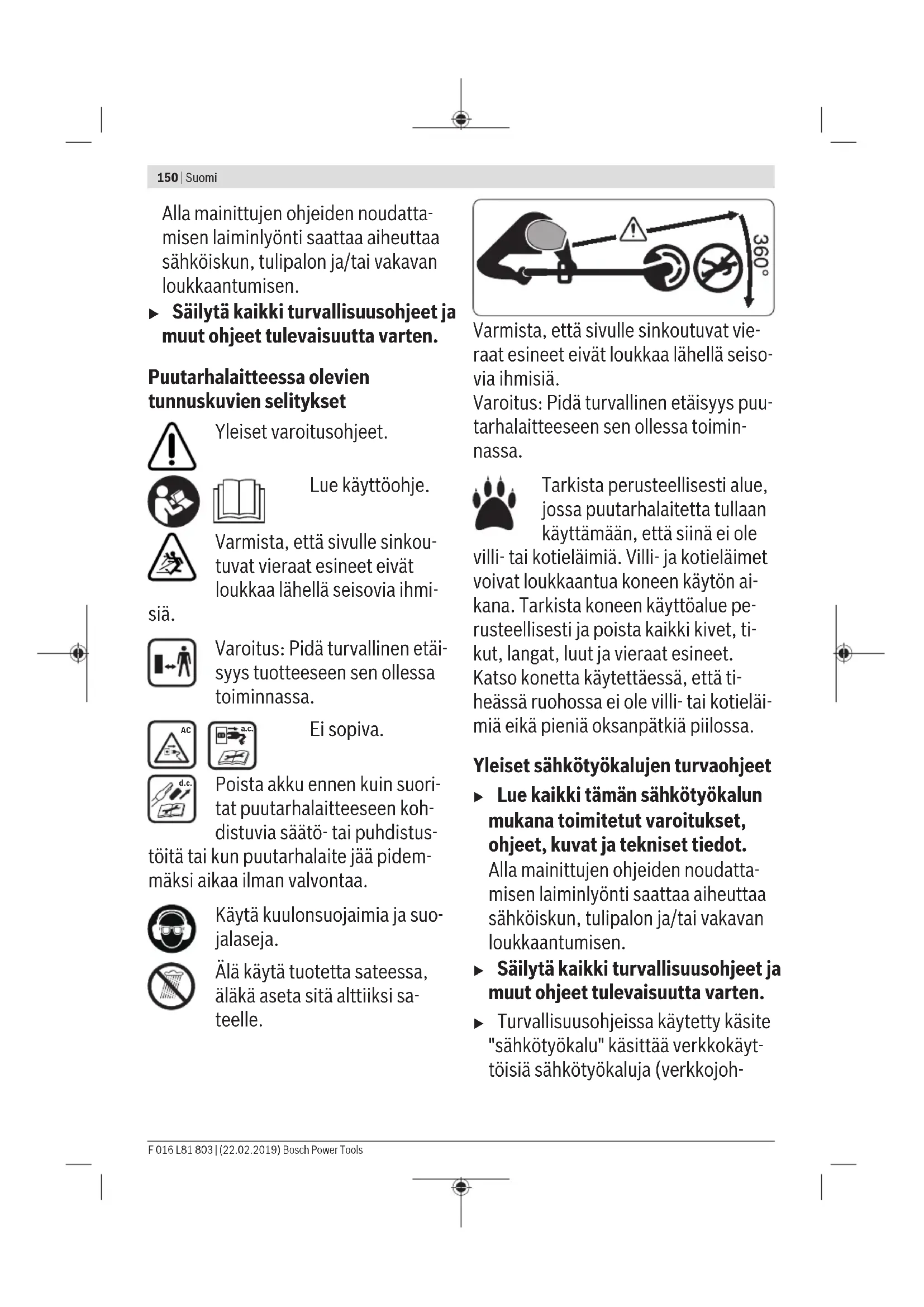 a.c. Ei sopiva. d.c. Poista akku ennen kuin suori- tat puutarhalaitteeseen koh- distuvia säätö- tai puhdistus- töitä tai kun puutarhalaite jää pidem- mäksi aikaa ilman valvontaa. Käytä kuulonsuojaimia ja suo- jalaseja. Älä käytä tuotetta sateessa, äläkä aseta sitä alttiiksi sa- teelle. Varmista, että sivulle sinkoutuvat vie- raat esineet eivät loukkaa lähellä seiso- via ihmisiä. Varoitus: Pidä turvallinen etäisyys puu- tarhalaitteeseen sen ollessa toimin- nassa. Tarkista perusteellisesti alue, jossa puutarhalaitetta tullaan käyttämään, että siinä ei ole villi- tai kotieläimiä. Villi- ja kotieläimet voivat loukkaantua koneen käytön ai- kana. Tarkista koneen käyttöalue pe- rusteellisesti ja poista kaikki kivet, ti- kut, langat, luut ja vieraat esineet. Katso konetta käytettäessä, että ti- heässä ruohossa ei ole villi- tai kotieläi- miä eikä pieniä oksanpätkiä piilossa. Yleiset sähkötyökalujen turvaohjeet u Lue kaikki tämän sähkötyökalun mukana toimitetut varoitukset, ohjeet, kuvat ja tekniset tiedot. Alla mainittujen ohjeiden noudatta- misen laiminlyönti saattaa aiheuttaa sähköiskun, tulipalon ja/tai vakavan loukkaantumisen. u Säilytä kaikki turvallisuusohjeet ja muut ohjeet tulevaisuutta varten. u Turvallisuusohjeissa käytetty käsite "sähkötyökalu" käsittää verkkokäyt- töisiä sähkötyökaluja (verkkojoh- F 016 L81 803 | (22.02.2019) Bosch Power ToolsSuomi | 151 dolla) ja akkukäyttöisiä sähkötyöka- luja (ilman verkkojohtoa). Työpaikan turvallisuus u Pidä työskentelyalue puhtaana ja hyvin valaistuna. Työpaikan epäjär- jestys tai valaisemattomat työalueet voivat johtaa tapaturmiin. u Älä työskentele sähkötyökalulla räjähdysalttiissa ympäristössä, jossa on palavaa nestettä, kaasua tai pölyä. Sähkötyökalu muodostaa kipinöitä, jotka saattavat sytyttää pö- lyn tai höyryn. u Pidä lapset ja sivulliset loitolla sähkötyökalua käyttäessäsi. Voit menettää laitteen hallinnan, jos suuntaat huomiosi muualle. Sähköturvallisuus u Sähkötyökalun pistotulpan tulee sopia pistorasiaan. Pistotulppaa ei saa muuttaa millään tavalla. Älä käytä minkäänlaisia pistorasia- adaptereita maadoitettujen sähkö- työkalujen kanssa. Alkuperäisessä kunnossa olevat pistotulpat ja sopi- vat pistorasiat vähentävät sähköis- kun vaaraa. u Vältä maadoitettujen pintojen, ku- ten putkien, pattereiden, liesien tai jääkaappien koskettamista. Sähköiskun vaara kasvaa, jos kehosi on maadoitettu. u Älä altista sähkötyökalua sateelle tai kosteudelle. Veden pääsy säh- kötyökalun sisään kasvattaa sähköis- kun riskiä. u Älä käytä verkkojohtoa väärin. Älä käytä johtoa sähkötyökalun kanta- miseen, ripustamiseen tai pistotul- pan irrottamiseen pistorasiasta vetämällä. Pidä johto loitolla kuu- muudesta, öljystä, terävistä reu- noista ja liikkuvista osista. Vahin- goittuneet tai sotkeutuneet johdot kasvattavat sähköiskun vaaraa. u Käyttäessäsi sähkötyökalua ul- kona käytä ainoastaan ulkokäyt- töön soveltuvaa jatkojohtoa. Ulko- käyttöön soveltuvan jatkojohdon käyttö pienentää sähköiskun vaaraa. u Jos sähkötyökalua on pakko käyt- tää kosteassa ympäristössä, on käytettävä vikavirtasuojakyt- kintä. Vikavirtasuojakytkimen käyttö vähentää sähköiskun vaaraa. Henkilöturvallisuus u Ole valpas, kiinnitä huomiota työs- kentelyysi ja noudata tervettä jär- keä sähkötyökalua käyttäessäsi. Älä käytä mitään sähkötyökalua, jos olet väsynyt tai huumeiden, al- koholin tai lääkkeiden vaikutuksen alaisena. Hetken tarkkaamattomuus sähkötyökalua käytettäessä saattaa johtaa vakavaan loukkaantumiseen. u Käytä henkilökohtaisia suojava- rusteita. Käytä aina suojalaseja. Henkilökohtaisen suojavarustuksen (esim. pölynaamari, luistamattomat turvajalkineet, suojakypärä tai kuu- Bosch Power Tools F 016 L81 803 | (22.02.2019)152 | Suomi lonsuojaimet kulloisenkin tehtävän mukaan) käyttö vähentää loukkaan- tumisriskiä. u Estä tahaton käynnistyminen. Varmista, että käynnistyskytkin on kytketty pois päältä ennen kuin yhdistät työkalun sähköverkkoon ja/tai akkuun, otat työkalun kä- teen tai kannat sitä. Jos kannat sähkötyökalua sormi käynnistyskyt- kimellä tai kytket sähkötyökalun pis- totulpan pistorasiaan käynnistyskyt- kimen ollessa käyntiasennossa, altis- tat itsesi onnettomuuksille. u Poista mahdollinen säätötyökalu tai kiinnitysavain ennen kuin käyn- nistät sähkötyökalun. Kiinnitysa- vain tai säätötyökalu, joka on unoh- dettu paikalleen sähkötyökalun pyö- rivään osaan, saattaa aiheuttaa tapa- turman. u Vältä kurkottelua. Huolehdi aina tukevasta seisoma-asennosta ja tasapainosta. Näin pystyt parem- min hallitsemaan sähkötyökalun odottamattomissa tilanteissa. u Käytä tarkoitukseen soveltuvia vaatteita. Älä käytä löysiä työ- vaatteita tai koruja. Pidä hiukset ja vaatteet poissa liikkuvien osien ulottuvilta. Väljät vaatteet, korut ja pitkät hiukset voivat takertua liikku- viin osiin. u Jos laitteissa on pölynpoistolii- täntä, varmista, että se on kyt- ketty oikein ja toimii kunnolla. Pö- lynpoistojärjestelmän käyttö vähen- tää pölyn aiheuttamia vaaroja. u Työskentele keskittyneesti ja nou- data aina turvallisuusmääräyksiä. Hetkellinenkin huolimattomuus voi aiheuttaa vakavia vammoja. Sähkötyökalun käyttö ja huolto u Älä ylikuormita laitetta. Käytä ky- seiseen työhön tarkoitettua sähkö- työkalua. Sopivan tehoisella sähkö- työkalulla teet työt paremmin ja tur- vallisemmin. u Älä käytä sähkötyökalua, jota ei voida käynnistää ja pysäyttää käynnistyskytkimestä. Sähkötyö- kalu, jota ei voi enää hallita käynnis- tyskytkimellä, on vaarallinen ja täy- tyy korjauttaa. u Irrota pistotulppa pistorasiasta ja/ tai irrota akku (jos irrotettava) sähkötyökalusta, ennen kuin suo- ritat säätöjä, vaihdat tarvikk