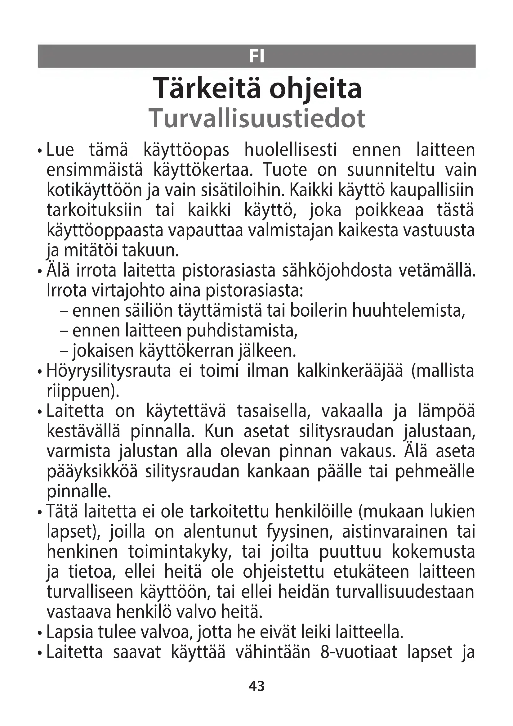 - Laitetta saavat käyttää vähintään 8-vuotiaat lapset ja44 henkilöt, joilla ei ole tarvittavaa kokemusta ja tietoa, tai joiden fyysinen, aistinvarainen tai henkinen toimintakyky on heikentynyt, jos heitä on opastettu ja valvotaan turvallisessa käytössä, ja he ymmärtävät käyttöön liittyvät vaarat. Lapset eivät saa leikkiä laitteella. Lapset eivät saa puhdistaa tai kunnossapitää laitetta ilman valvontaa. Pidä silitysrauta ja sen virtajohto poissa alle 8-vuotiaiden lasten ulottuvilta silloin, kun silitysrauta on kytkettynä sähkövirtaan tai kun se on jäähtymässä.