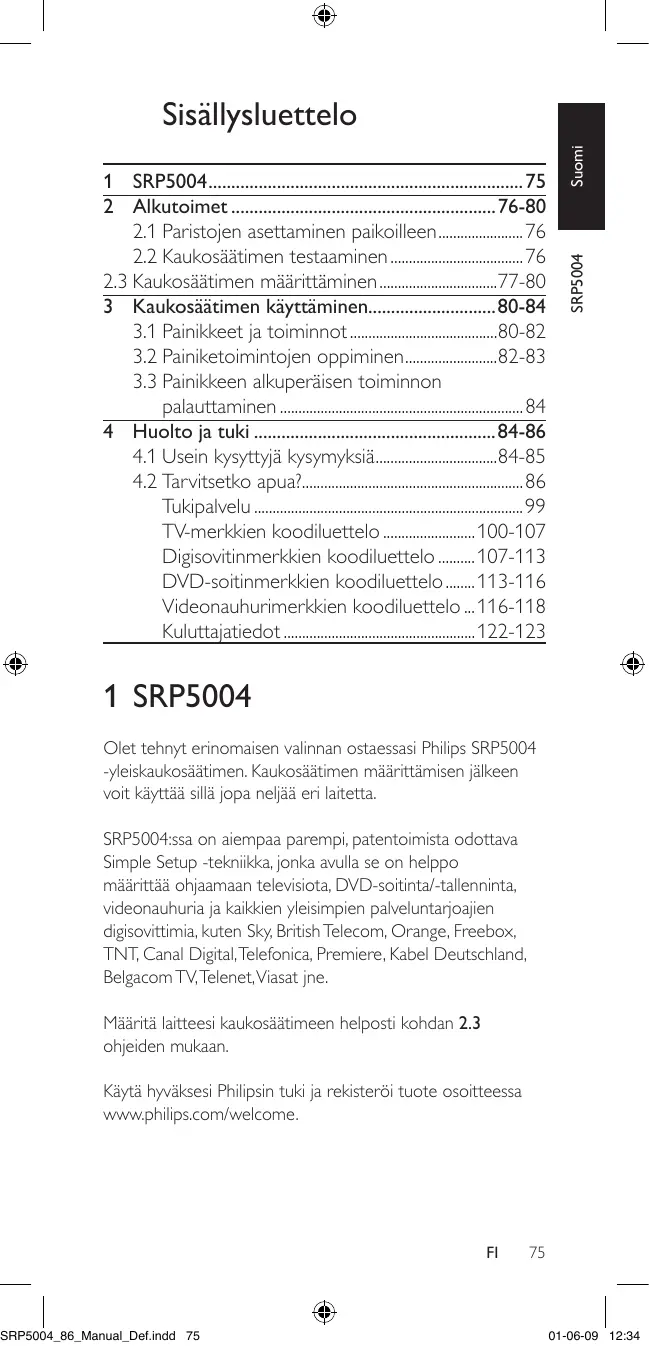 - -118 Kuluttajatiedot -123 Suomi Sisällysluettelo 1 SRP5004 Olet tehnyt erinomaisen valinnan ostaessasi Philips SRP5004 -yleiskaukosäätimen. Kaukosäätimen määrittämisen jälkeen voit käyttää sillä jopa neljää eri laitetta. SRP5004:ssa on aiempaa parempi, patentoimista odottava Simple Setup -tekniikka, jonka avulla se on helppo määrittää ohjaamaan televisiota, DVD-soitinta/-tallenninta, videonauhuria ja kaikkien yleisimpien palveluntarjoajien digisovittimia, kuten Sky, British Telecom, Orange, Freebox, TNT, Canal Digital, Telefonica, Premiere, Kabel Deutschland, Belgacom TV, Telenet, Viasat jne. Määritä laitteesi kaukosäätimeen helposti kohdan 2.3 ohjeiden mukaan. Käytä hyväksesi Philipsin tuki ja rekisteröi tuote osoitteessa www.philips.com/welcome. SRP5004_86_Manual_Def.indd 75 p. 122