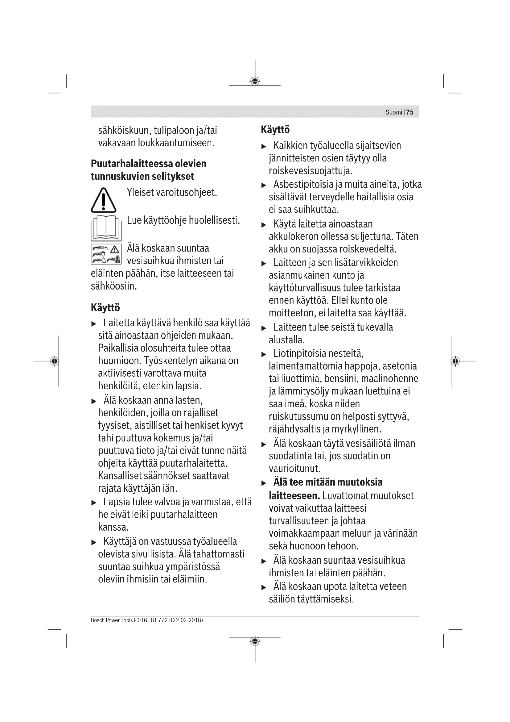 Laitetta kayttava henkiloo saa kayttaa sitaainoastaan ohjeiden mukaan. Paikallisia olosuheita tulee ottaa huomioon. Tyoskentelyn aikana on aktivisesti varottava muita henkilooita, etenkin lapsia.
