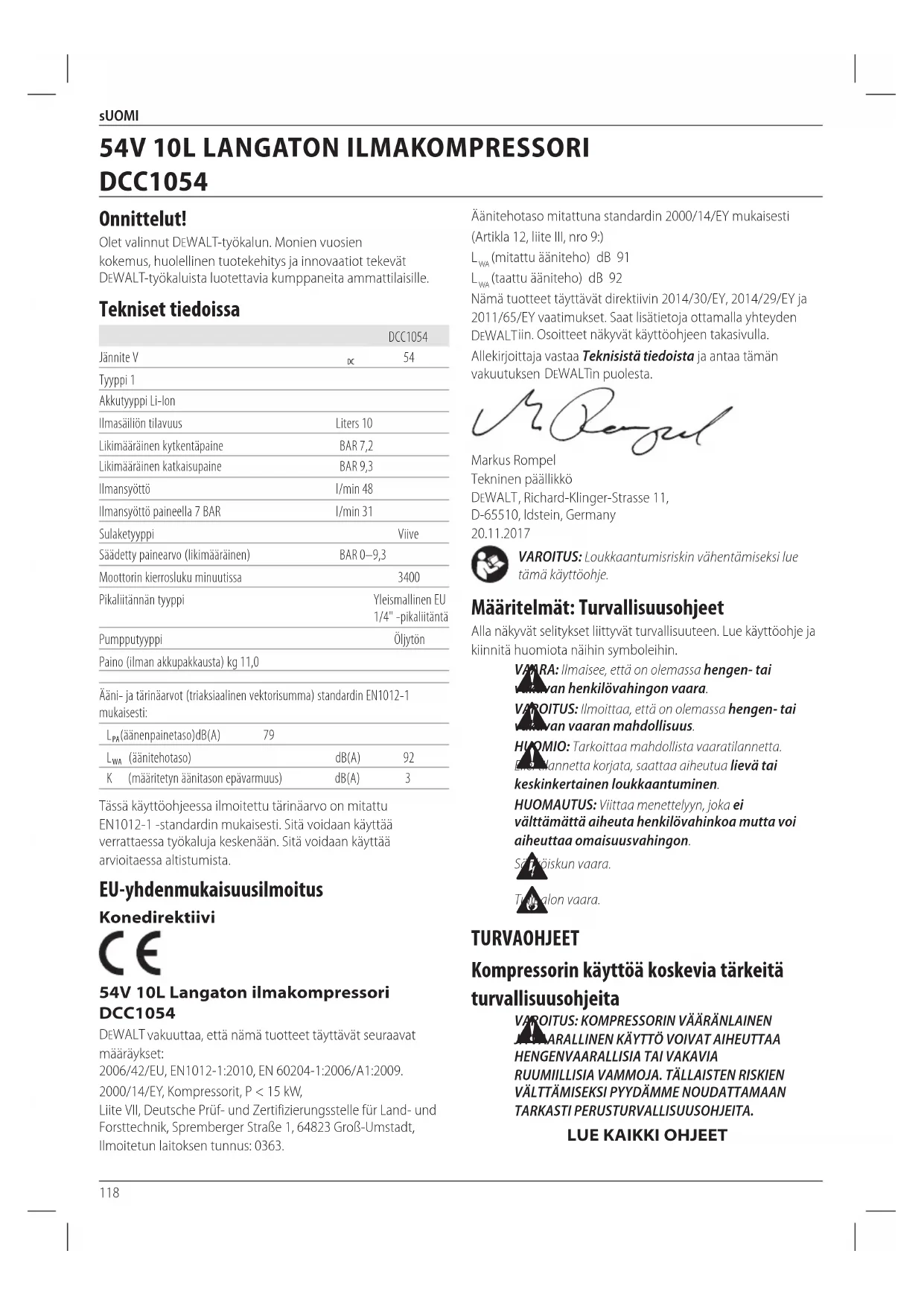 (äänitehotaso) dB(A) 92 K (määritetyn äänitason epävarmuus) dB(A) 3 Tässä käyttöohjeessa ilmoitettu tärinäarvo on mitattu EN1012‑1 ‑standardin mukaisesti. Sitä voidaan käyttää verrattaessa työkaluja keskenään. Sitä voidaan käyttää arvioitaessaaltistumista. EU‑yhdenmukaisuusilmoitus Konedirektiivi 54V 10L Langaton ilmakompressori DCC1054 DeWALT vakuuttaa, että nämä tuotteet täyttävät seuraavat määräykset: 2006/42/EU, EN1012‑1:2010, EN 60204‑1:2006/A1:2009. 2000/14/EY, Kompressorit, P < 15 kW, Liite VII, Deutsche Prüf‑ und Zertifizierungsstelle für Land‑ und Forsttechnik, Spremberger Straße 1, 64823 Groß‑Umstadt, Ilmoitetun laitoksen tunnus:0363. Suomi (käännetty alkuperäisestä käyttöohjeesta)