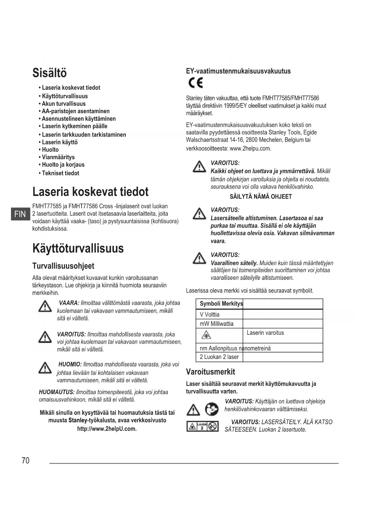 - Tekniset tiedot Laseria koskevat tiedot FMHT77585 ja FMHT77586 Cross -linjalaserit ovat luokan 2 lasertuotteita. Laserit ovat itsetasaavia laserlaitteita, joita voidaan käyttää vaaka- (taso) ja pystysuuntaisissa (kohtisuora) kohdistuksissa. Käyttöturvallisuus Turvallisuusohjeet Alla olevat määritykset kuvaavat kunkin varoitussanan tärkeystason. Lue ohjekirja ja kiinnitä huomiota seuraaviin merkkeihin. VAARA: Ilmoittaa välittömästä vaarasta, joka johtaa kuolemaan tai vakavaan vammautumiseen, mikäli sitä ei vältetä. VAROITUS: Ilmoittaa mahdollisesta vaarasta, joka voi johtaa kuolemaan tai vakavaan vammautumiseen, mikäli sitä ei vältetä. HUOMIO: Ilmoittaa mahdollisesta vaarasta, joka voi johtaa lievään tai kohtalaisen vakavaan vammautumiseen, mikäli sitä ei vältetä. HUOMAUTUS: Ilmoittaa toimenpiteestä, joka voi johtaa omaisuusvahinkoon, mikäli sitä ei vältetä. Mikäli sinulla on kysyttävää tai huomautuksia tästä tai muusta Stanley-työkalusta, avaa verkkosivusto http://www.2helpU.com. EY-vaatimustenmukaisuusvakuutus Stanley täten vakuuttaa, että tuote FMHT77585/FMHT77586 täyttää direktiivin 1999/5/EY oleelliset vaatimukset ja kaikki muut määräykset. EY-vaatimustenmukaisuusvakuutuksen koko teksti on saatavilla pyydettäessä osoitteesta Stanley Tools, Egide Walschaertsstraat 14-16, 2800 Mechelen, Belgium tai verkkoosoitteesta: www.2helpu.com. VAROITUS: Kaikki ohjeet on luettava ja ymmärrettävä. Mikäli tämän ohjekirjan varoituksia ja ohjeita ei noudateta, seurauksena voi olla vakava henkilövahinko.