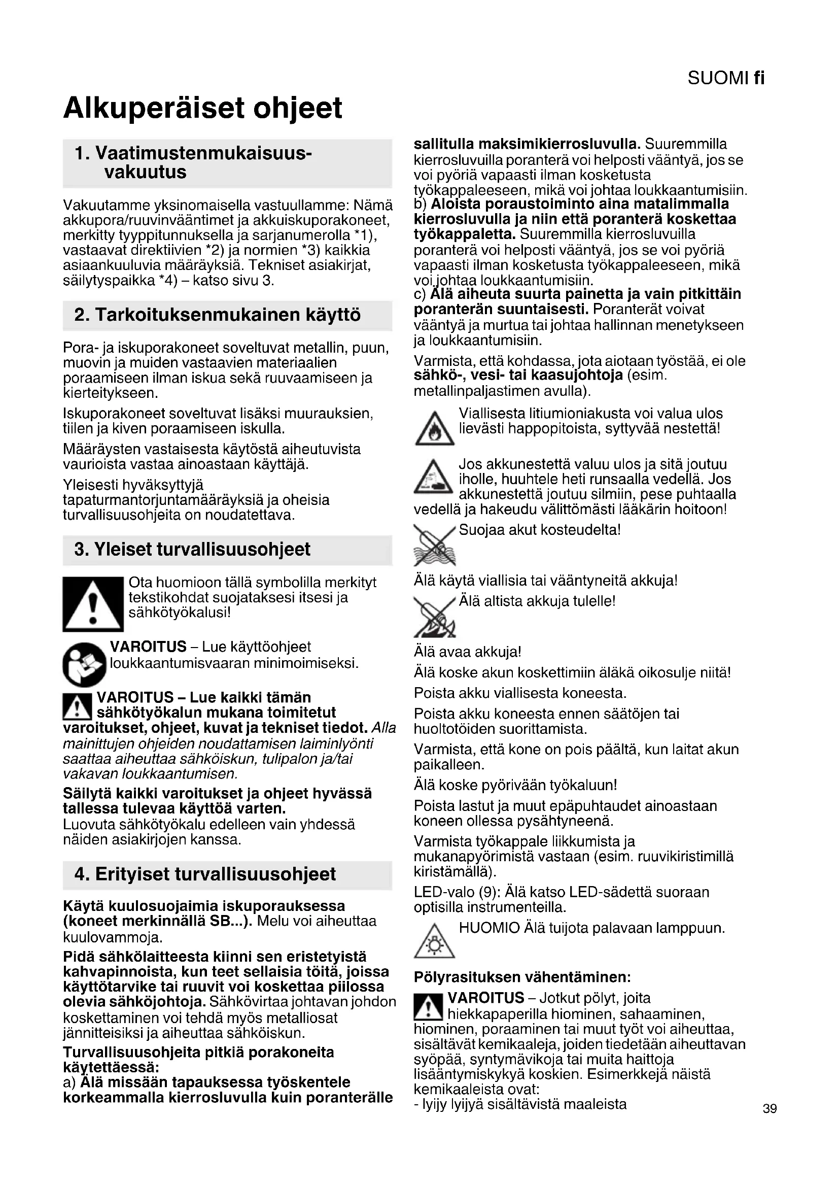Alkuperäiset ohjeet Vakuutamme yksinomaisella vastuullamme: Nämä akkupora/ruuvinvääntimet ja akkuiskuporakoneet, merkitty tyyppitunnuksella ja sarjanumerolla *1), vastaavat direktiivien *2) ja normien *3) kaikkia asiaankuuluvia määräyksiä. Tekniset asiakirjat, säilytyspaikka *4) – katso sivu 3. Pora- ja iskuporakoneet soveltuvat metallin, puun, muovin ja muiden vastaavien materiaalien poraamiseen ilman iskua sekä ruuvaamiseen ja kierteitykseen. Iskuporakoneet soveltuvat lisäksi muurauksien, tiilen ja kiven poraamiseen iskulla. Määräysten vastaisesta käytöstä aiheutuvista vaurioista vastaa ainoastaan käyttäjä. Yleisesti hyväksyttyjä tapaturmantorjuntamääräyksiä ja oheisia turvallisuusohjeita on noudatettava. Ota huomioon tällä symbolilla merkityt tekstikohdat suojataksesi itsesi ja sähkötyökalusi! VAROITUS – Lue käyttöohjeet loukkaantumisvaaran minimoimiseksi. VAROITUS – Lue kaikki tämän sähkötyökalun mukana toimitetut varoitukset, ohjeet, kuvat ja tekniset tiedot. Alla mainittujen ohjeiden noudattamisen laiminlyönti saattaa aiheuttaa sähköiskun, tulipalon ja/tai vakavan loukkaantumisen. Säilytä kaikki varoitukset ja ohjeet hyvässä tallessa tulevaa käyttöä varten. Luovuta sähkötyökalu edelleen vain yhdessä näiden asiakirjojen kanssa. Käytä kuulosuojaimia iskuporauksessa (koneet merkinnällä SB...). Melu voi aiheuttaa kuulovammoja. Pidä sähkölaitteesta kiinni sen eristetyistä kahvapinnoista, kun teet sellaisia töitä, joissa käyttötarvike tai ruuvit voi koskettaa piilossa olevia sähköjohtoja. Sähkövirtaa johtavan johdon koskettaminen voi tehdä myös metalliosat jännitteisiksi ja aiheuttaa sähköiskun. Turvallisuusohjeita pitkiä porakoneita käytettäessä: a) Älä missään tapauksessa työskentele korkeammalla kierrosluvulla kuin poranterälle sallitulla maksimikierrosluvulla. Suuremmilla kierrosluvuilla poranterä voi helposti vääntyä, jos se voi pyöriä vapaasti ilman kosketusta työkappaleeseen, mikä voi johtaa loukkaantumisiin. b) Aloista poraustoiminto aina matalimmalla kierrosluvulla ja niin että poranterä koskettaa työkappaletta. Suuremmilla kierrosluvuilla poranterä voi helposti vääntyä, jos se voi pyöriä vapaasti ilman kosketusta työkappaleeseen, mikä voi johtaa loukkaantumisiin. c) Älä aiheuta suurta painetta ja vain pitkittäin poranterän suuntaisesti. Poranterät voivat vääntyä ja murtua tai johtaa hallinnan menetykseen ja loukkaantumisiin. Varmista, että kohdassa, jota aiotaan työstää, ei ole sähkö-, vesi- tai kaasujohtoja (esim. metallinpaljastimen avulla). Viallisesta litiumioniakusta voi valua ulos lievästi happopitoista, syttyvää nestettä! Jos akkunestettä valuu ulos ja sitä joutuu iholle, huuhtele heti runsaalla vedellä. Jos akkunestettä joutuu silmiin, pese puhtaalla vedellä ja hakeudu välittömästi lääkärin hoitoon! Suojaa akut kosteudelta! Älä käytä viallisia tai vääntyneitä akkuja! Älä altista akkuja tulelle! Älä avaa akkuja! Älä koske akun koskettimiin äläkä oikosulje niitä! Poista akku viallisesta koneesta. Poista akku koneesta ennen säätöjen tai huoltotöiden suorittamista. Varmista, että kone on pois päältä, kun laitat akun paikalleen. Älä koske pyörivään työkaluun! Poista lastut ja muut epäpuhtaudet ainoastaan koneen ollessa pysähtyneenä. Varmista työkappale liikkumista ja mukanapyörimistä vastaan (esim. ruuvikiristimillä kiristämällä). LED-valo (9): Älä katso LED-sädettä suoraan optisilla instrumenteilla. HUOMIO Älä tuijota palavaan lamppuun. Pölyrasituksen vähentäminen: VAROITUS – Jotkut pölyt, joita hiekkapaperilla hiominen, sahaaminen, hiominen, poraaminen tai muut työt voi aiheuttaa, sisältävät kemikaaleja, joiden tiedetään aiheuttavan syöpää, syntymävikoja tai muita haittoja lisääntymiskykyä koskien. Esimerkkejä näistä kemikaaleista ovat: - lyijy lyijyä sisältävistä maaleista