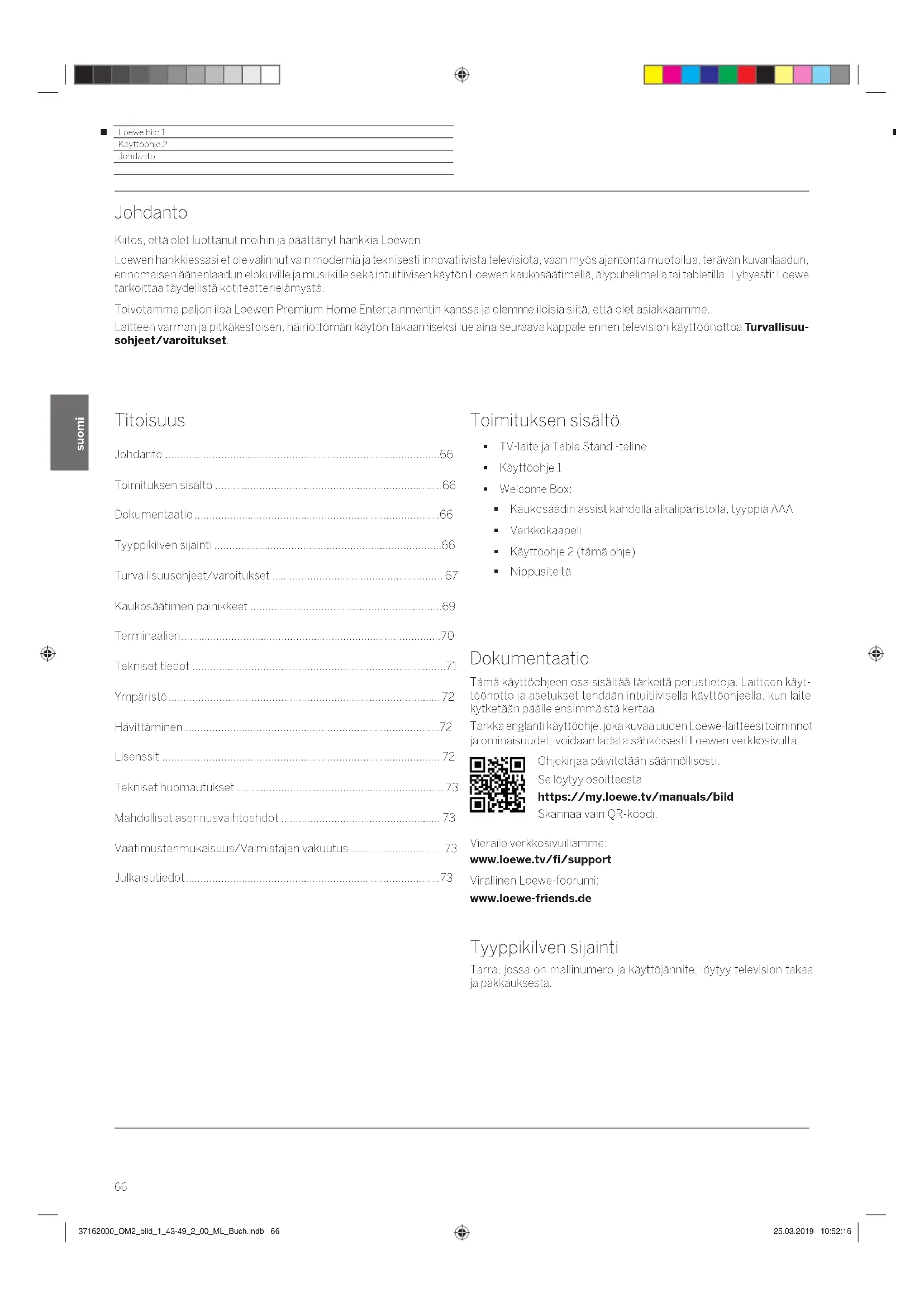 - Julkaisutiedot Dokumentaatio Tämä käyttöohjeen osa sisältää tärkeitä perustietoja. Laitteen käyt- töönotto ja asetukset tehdään intuitiivisella käyttöohjeella, kun laite kytketään päälle ensimmäistä kertaa. Tarkka englanti käyttöohje, joka kuvaa uuden Loewe-laitteesi toiminnot ja ominaisuudet, voidaan ladata sähköisesti Loewen verkkosivulta. Ohjekirjaa päivitetään säännöllisesti. Se löytyy osoitteesta https://my.loewe.tv/manuals/bild Skannaa vain QR-koodi. Vieraile verkkosivuillamme: www.loewe.tv/fi/support Virallinen Loewe-foorumi: www.loewe-friends.de Tyyppikilven sijainti Tarra, jossa on mallinumero ja käyttöjännite, löytyy television takaa ja pakkauksesta. 37162000_OM2_bild_1_43-49_2_00_ML_Buch.indb 6637162000_OM2_bild_1_43-49_2_00_ML_Buch.indb 66 25.03.2019 10:52:1625.03.2019 10:52:16Loewe bild 1 Käyttöohje 2 p. 73