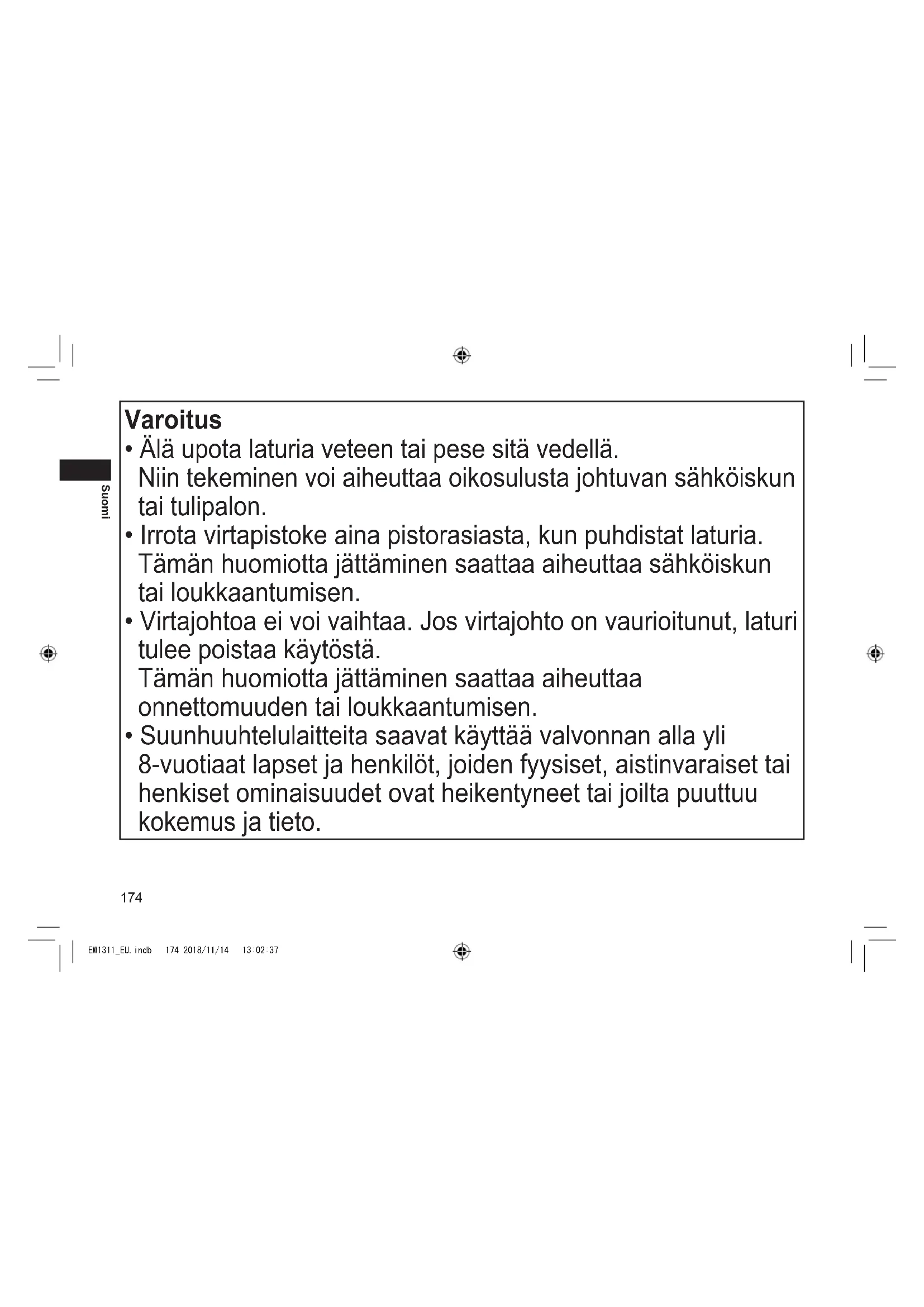 Nimellistehon ylittäminen, joka johtuu siitä että liian monta virtapistoketta on yhdistetty yhteen pistorasiaan, voi aiheuttaa ylikuumenemisesta johtuvan tulipalon. EW1311_EU.indb 176 2018/11/14 13:02:37177 Suomi VAROITUS Varmistaaina,ettälaitettakäytetäänvoimalähteellä, jokaonyhteensopivalaturinnimellisjännitteen kanssa. Työnnävirtapistokeloppuunasti.