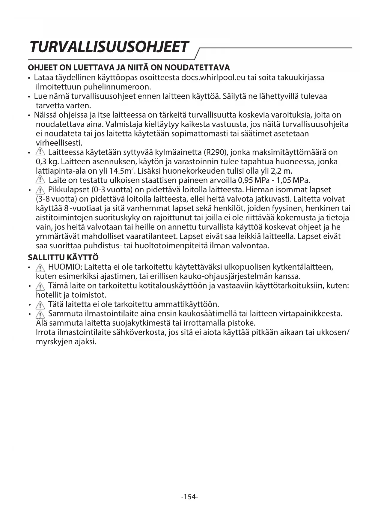 - Lataa täydellinen käyttöopas yksityiskohtaisia asennus-, huolto- ja korjaustietoja varten osoitteesta docs.whirlpool.eu.