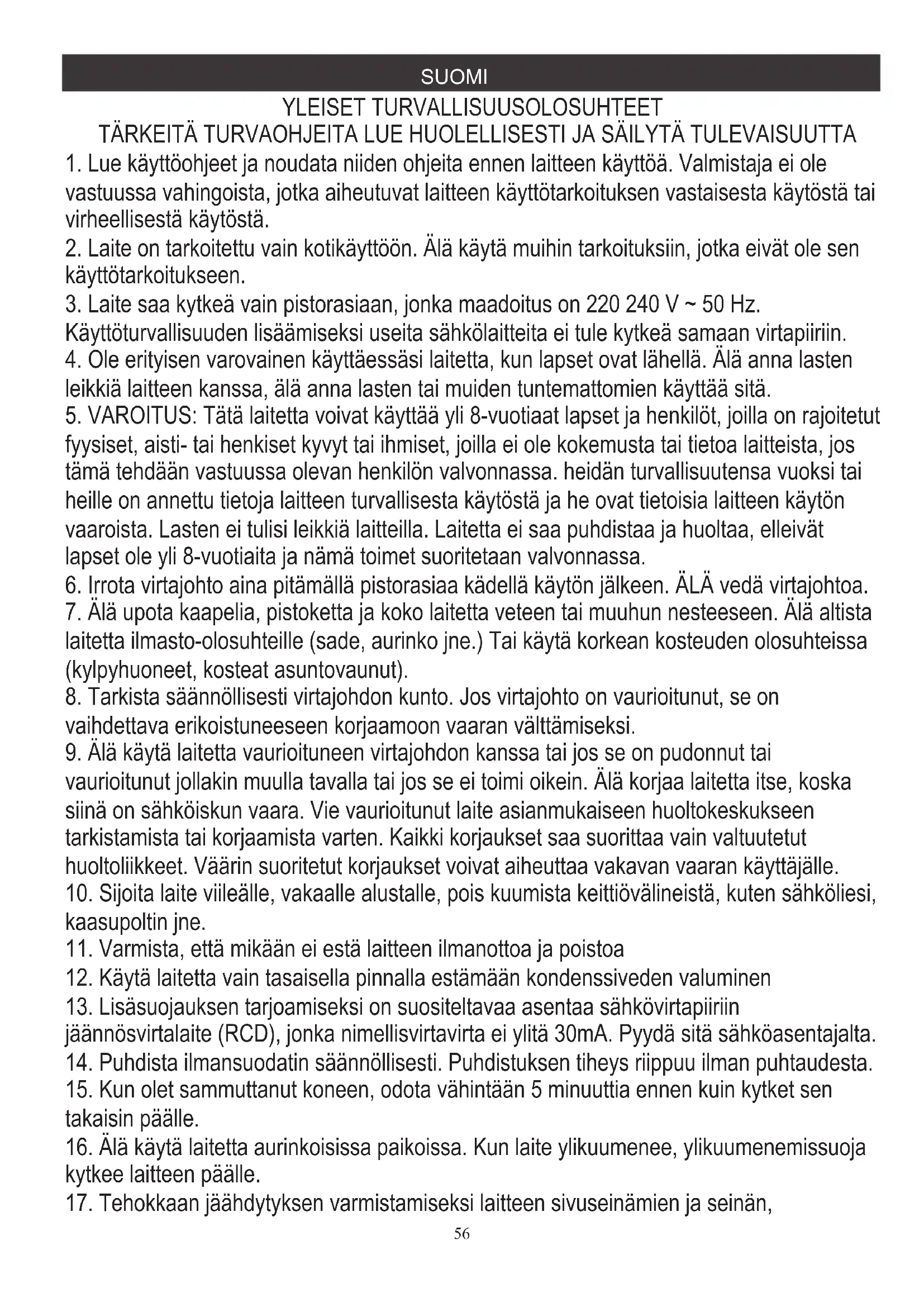 vastuussa vahingoista, jotka aiheutuvat laitteen käyttötarkoituksen vastaisesta käytöstä tai virheellisestä käytöstä. TÄRKEITÄ TURVAOHJEITA LUE HUOLELLISESTI JA SÄILYTÄ TULEVAISUUTTA
