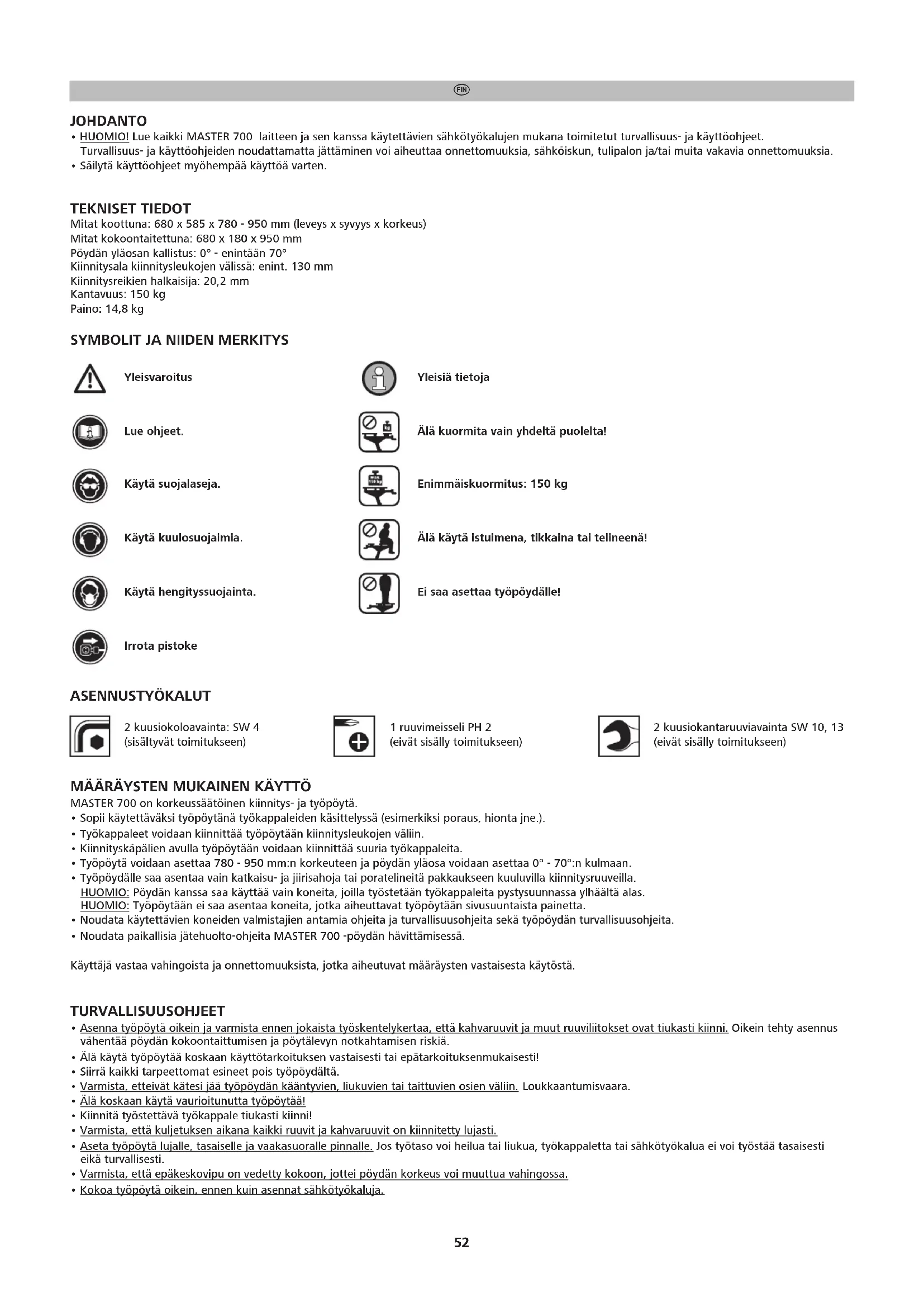 - HUOMIO! Lue kaikki MASTER 700 laitteen ja sen kanssa käytettävien sähkötyökalujen mukana toimitetut turvallisuus- ja käyttöohjeet. Turvallisuus- ja käyttöohjeiden noudattamatta jättäminen voi aiheuttaa onnettomuuksia, sähköiskun, tulipalon ja/tai muita vakavia onnettomuuksia.