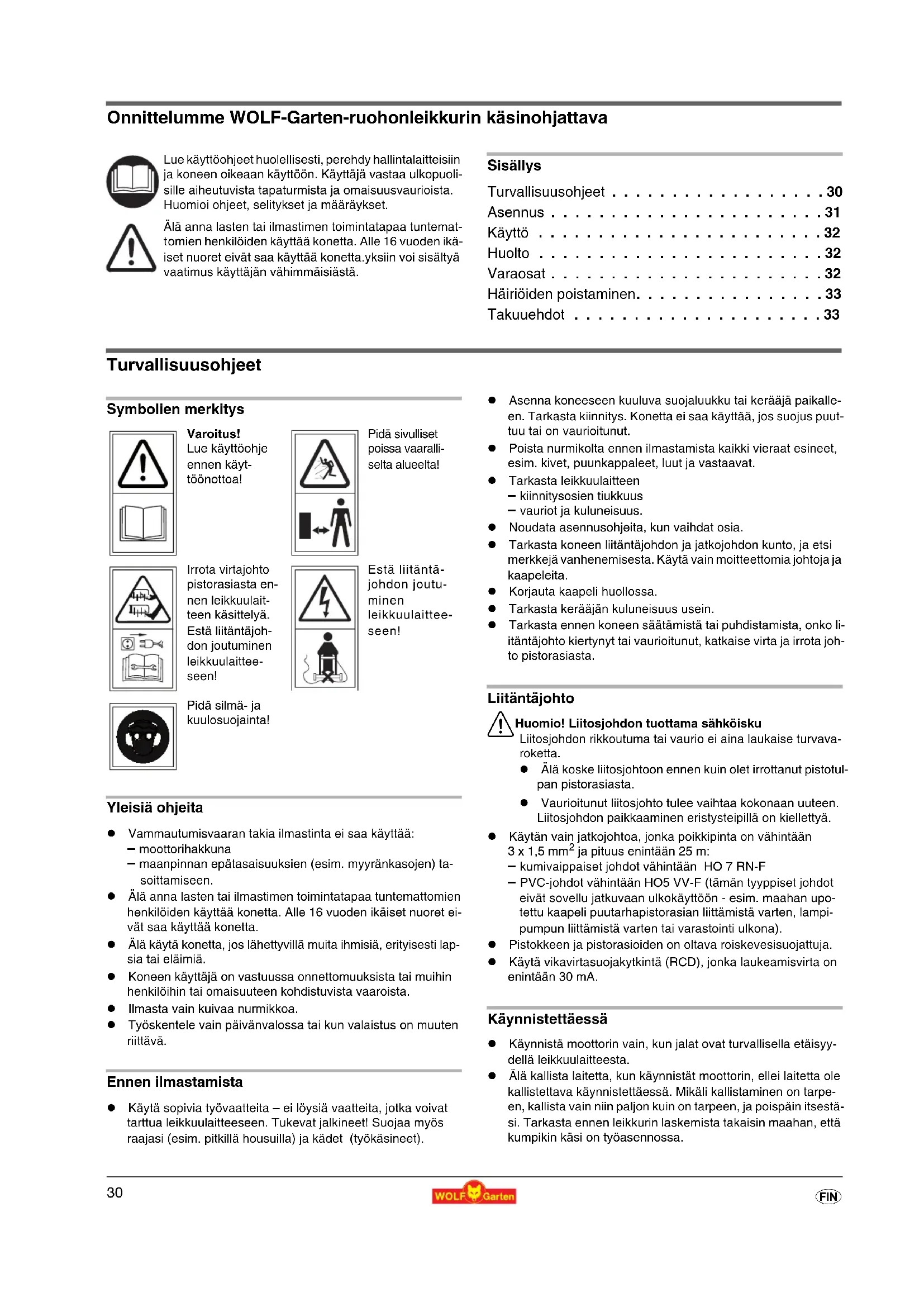 f Onnittelumme WOLF-Garten-ruohonleikkurin käsinohjattava Sisällys Turvallisuusohjeet . . . . . . . . . . . . . . . . . . 30 Asennus
