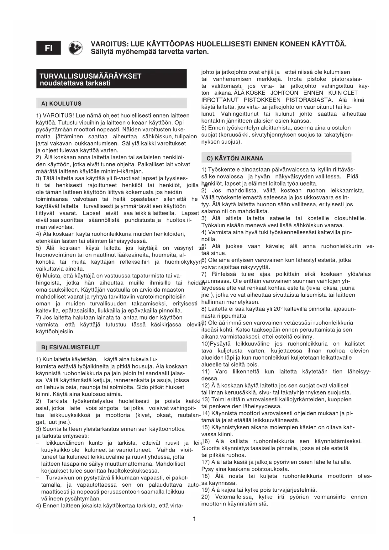noudatettava tarkasti A) KOULUTUS 1) VAROITUS! Lue nämä ohjeet huolellisesti ennen laitteen käyttöä. Tutustu vipuihin ja laitteen oikeaan käyttöön. Opi pysäyttämään moottori nopeasti. Näiden varoitusten luke- matta jättäminen saattaa aiheuttaa sähköiskun, tulipalon ja/tai vakavan loukkaantumisen. Säilytä kaikki varoitukset ja ohjeet tulevaa käyttöä varten. 2) Älä koskaan anna laitetta lasten tai sellaisten henkilöi- den käyttöön, jotka eivät tunne ohjeita. Paikalliset lait voivat määrätä laitteen käytölle minimi–ikärajan. 3) Tätä laitetta saa käyttää yli 8-vuotiaat lapset ja fyysises- ti tai henkisesti rajoittuneet henkilöt tai henkilöt, joilla ei ole tämän laitteen käyttöön liittyvä kokemusta jos heidän toimintaansa valvotaan tai heitä opastetaan siten että he käyttävät laitetta turvallisesti ja ymmärtävät sen käyttöön liittyvät vaarat. Lapset eivät saa leikkiä laitteella. Lapset eivät saa suorittaa säännöllistä puhdistusta ja huoltoa il- man valvontaa. 4) Älä koskaan käytä ruohonleikkuria muiden henkilöiden, etenkään lasten tai eläinten läheisyydessä. 5) Älä koskaan käytä laitetta jos käyttäjä on väsynyt tai huonovointinen tai on nauttinut lääkeaineita, huumeita, al- koholia tai muita käyttäjän reekseihin ja huomiokykyyn vaikuttavia aineita. 6) Muista, että käyttäjä on vastuussa tapaturmista tai va- hingoista, jotka hän aiheuttaa muille ihmisille tai heidän omaisuuksilleen. Käyttäjän vastuulla on arvioida maaston mahdolliset vaarat ja ryhtyä tarvittaviin varotoimenpiteisiin oman ja muiden turvallisuuden takaamiseksi, erityisesti kaltevilla, epätasaisilla, liukkailla ja epävakailla pinnoilla. 7) Jos laitetta halutaan lainata tai antaa muiden käyttöön varmista, että käyttäjä tutustuu tässä käsikirjassa oleviin käyttöohjeisiin. B) ESIVALMISTELUT 1) Kun laitetta käytetään, käytä aina tukevia liu- kumista estäviä työjalkineita ja pitkiä housuja. Älä koskaan käynnistä ruohonleikkuria paljain jaloin tai sandaalit jalas- sa. Vältä käyttämästä ketjuja, rannerenkaita ja asuja, joissa on liehuvia osia, nauhoja tai solmioita. Sido pitkät hiukset kiinni. Käytä aina kuulosuojaimia. 2) Tarkista työskentelyalue huolellisesti ja poista kaikki asiat, jotka laite voisi singota tai jotka voisivat vahingoit- taa leikkuuyksikköä ja moottoria (kivet, oksat, rautalan- gat, luut jne.). 3) Suorita laitteen yleistarkastus ennen sen käyttöönottoa ja tarkista erityisesti: – leikkuuvälineen kunto ja tarkista, etteivät ruuvit ja leik- kuuyksikkö ole kuluneet tai vaurioituneet. Vaihda vioit- tuneet tai kuluneet leikkuuväline ja ruuvit yhdessä, jotta laitteen tasapaino säilyy muuttumattomana. Mahdolliset korjaukset tulee suorittaa huoltokeskuksessa. – Turvavivun on pystyttävä liikkumaan vapaasti, ei pakot- tamalla, ja vapautettaessa sen on palauduttava auto- maattisesti ja nopeasti perusasentoon saamalla leikkuu- välineen pysähtymään. 4) Ennen laitteen jokaista käyttökertaa tarkista, että virta-