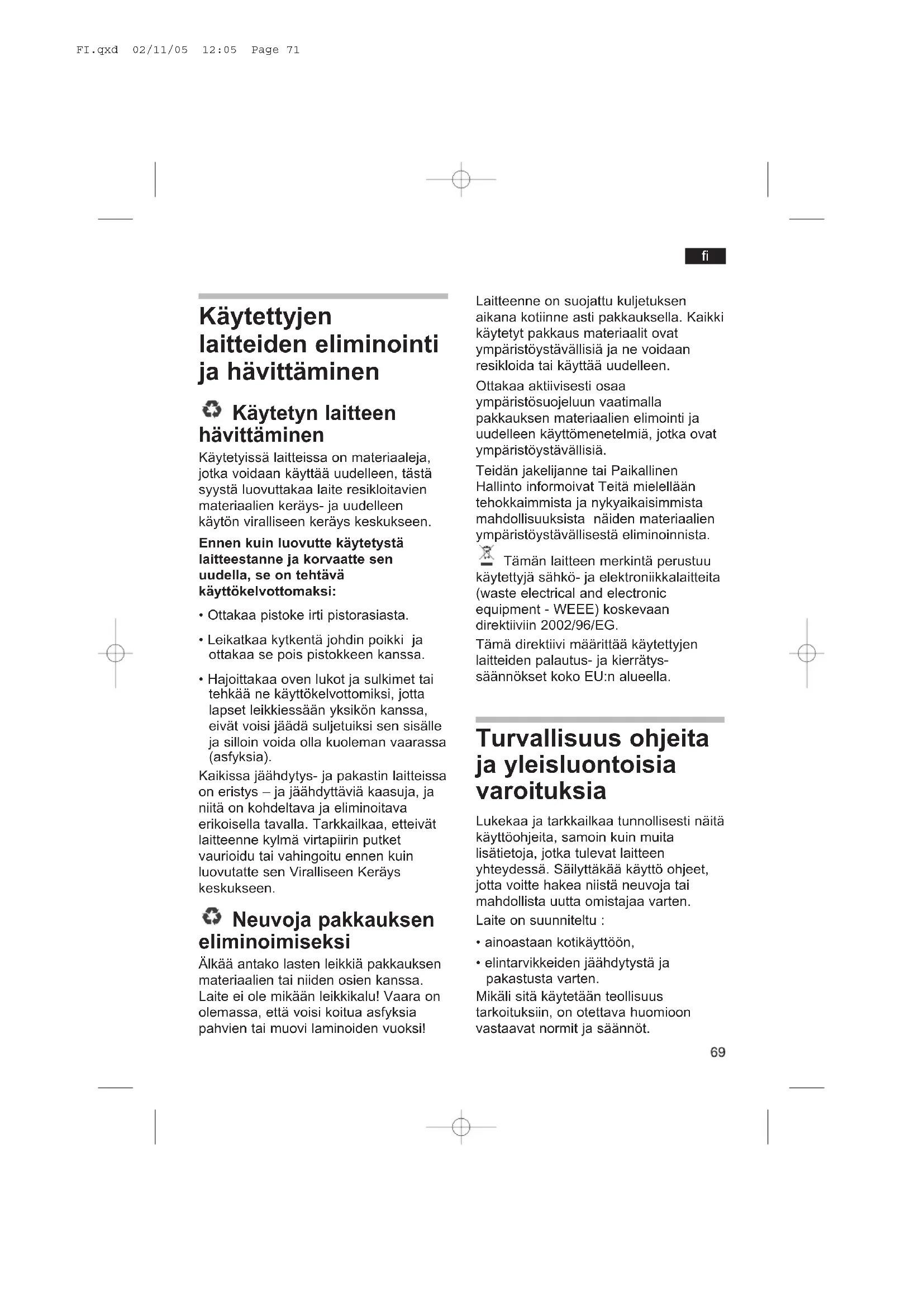 - Hajoittakaa oven lukot ja sulkimet tai tehkää ne käyttökelvottomiksi, jotta lapset leikkiessään yksikön kanssa, eivät voisi jäädä suljetuiksi sen sisälle ja silloin voida olla kuoleman vaarassa (asfyksia). Kaikissa jäähdytys- ja pakastin laitteissa on eristys – ja jäähdyttäviä kaasuja, ja niitä on kohdeltava ja eliminoitava erikoisella tavalla. Tarkkailkaa, etteivät laitteenne kylmä virtapiirin putket vaurioidu tai vahingoitu ennen kuin luovutatte sen Viralliseen Keräys keskukseen. Neuvoja pakkauksen eliminoimiseksi Älkää antako lasten leikkiä pakkauksen materiaalien tai niiden osien kanssa. Laite ei ole mikään leikkikalu! Vaara on olemassa, että voisi koitua asfyksia pahvien tai muovi laminoiden vuoksi! Laitteenne on suojattu kuljetuksen aikana kotiinne asti pakkauksella. Kaikki käytetyt pakkaus materiaalit ovat ympäristöystävällisiä ja ne voidaan resikloida tai käyttää uudelleen. Ottakaa aktiivisesti osaa ympäristösuojeluun vaatimalla pakkauksen materiaalien elimointi ja uudelleen käyttömenetelmiä, jotka ovat ympäristöystävällisiä. Teidän jakelijanne tai Paikallinen Hallinto informoivat Teitä mielellään tehokkaimmista ja nykyaikaisimmista mahdollisuuksista näiden materiaalien ympäristöystävällisestä eliminoinnista. Tämän laitteen merkintä perustuu käytettyjä sähkö- ja elektroniikkalaitteita (waste electrical and electronic equipment - WEEE) koskevaan direktiiviin 2002/96/EG. Tämä direktiivi määrittää käytettyjen laitteiden palautus- ja kierrätys- säännökset koko EU:n alueella. Turvallisuus ohjeita ja yleisluontoisia varoituksia Lukekaa ja tarkkailkaa tunnollisesti näitä käyttöohjeita, samoin kuin muita lisätietoja, jotka tulevat laitteen yhteydessä. Säilyttäkää käyttö ohjeet, jotta voitte hakea niistä neuvoja tai mahdollista uutta omistajaa varten. Laite on suunniteltu :