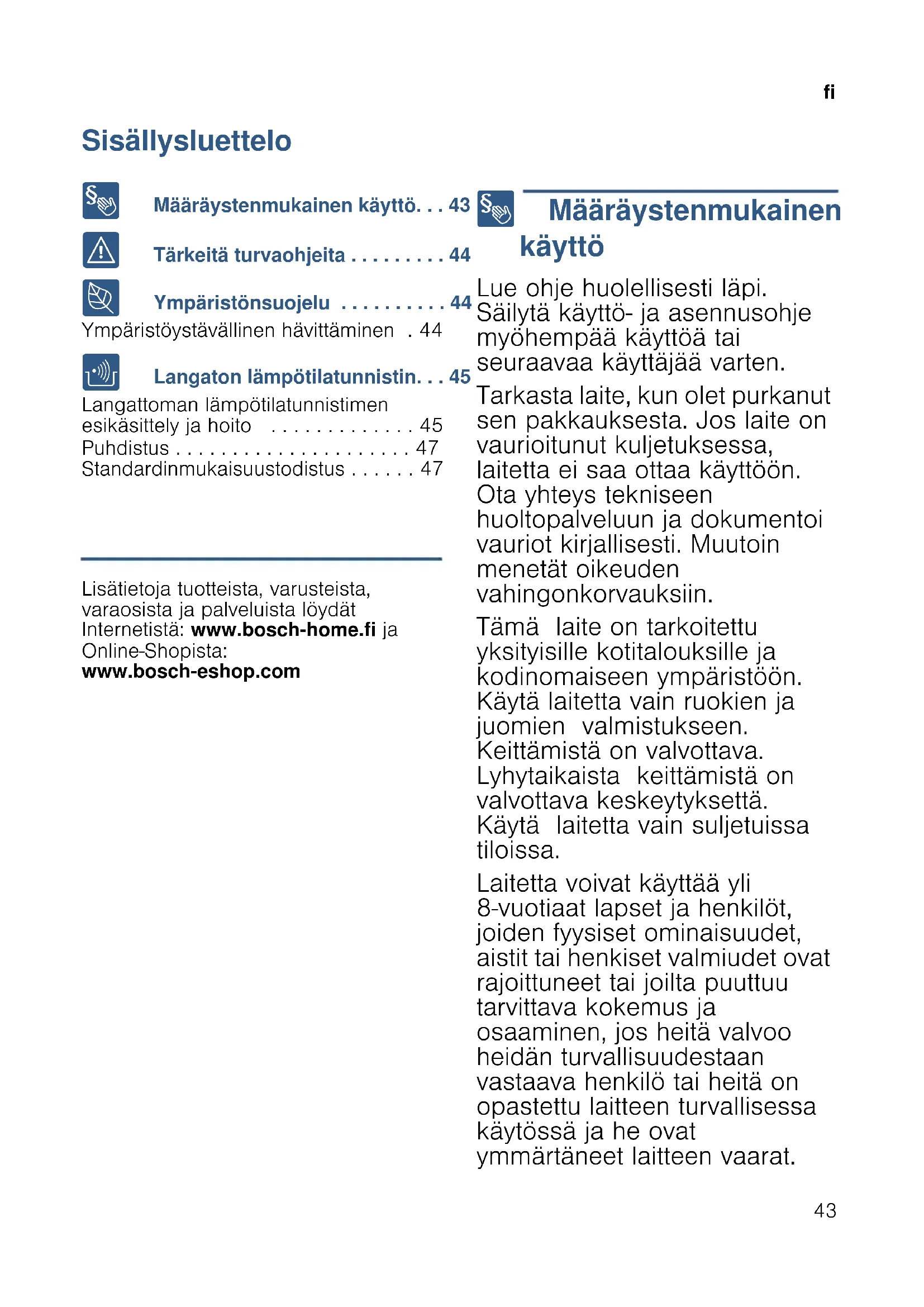 - Sisällysluettelo fiKäyttöohje 8 Määräystenmukainen käyttö p. 43