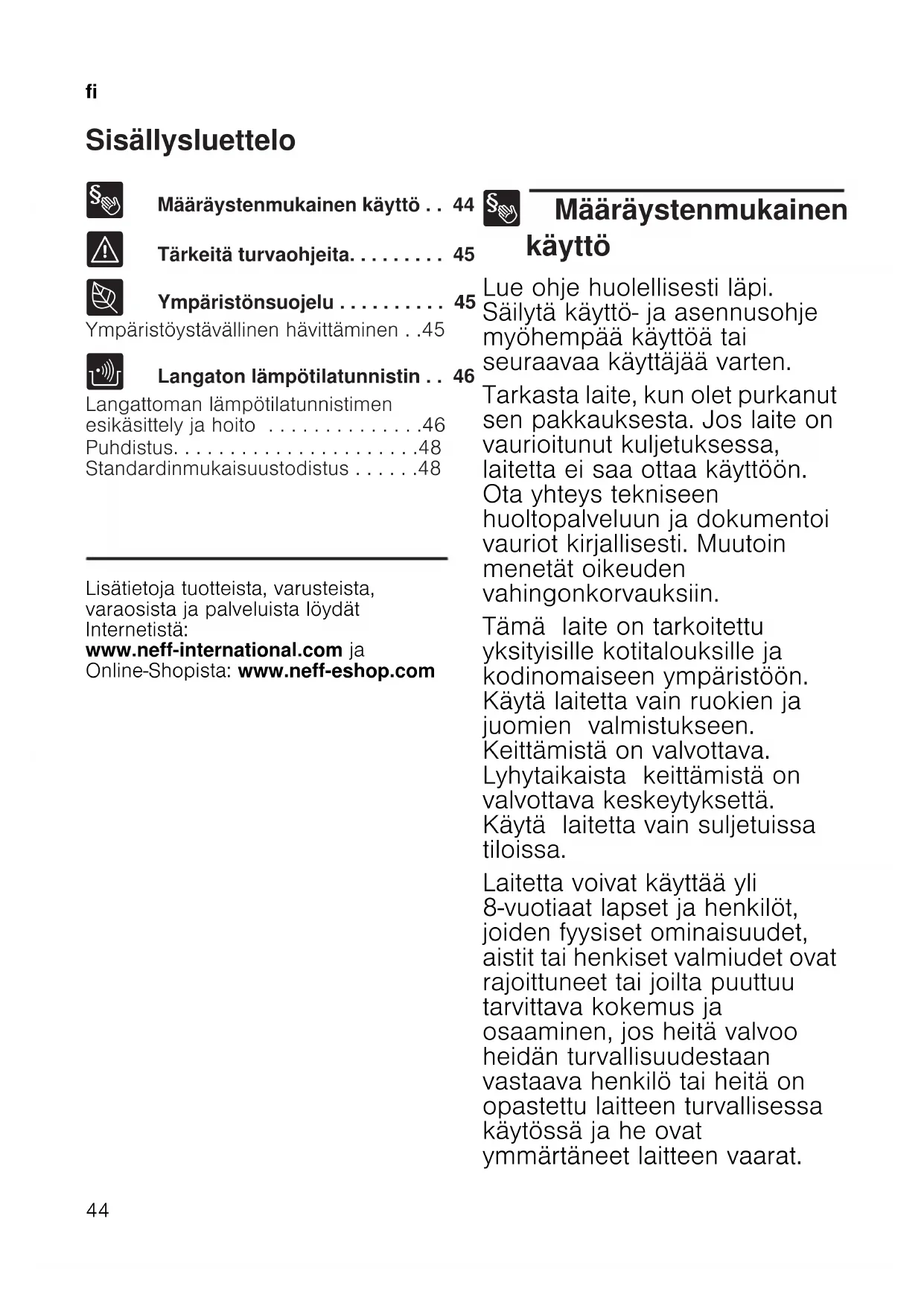- Standardinmukaisuustodistus Produktinfo Lisätietoja tuotteista, varusteista, varaosista ja palveluista löydät Internetistä: www.neff-international.com ja Online-Shopista: www.neff-eshop.com 8 Määräystenmukainen käyttö Määräystenmukainen käyttö Lue ohje huolellisesti läpi. Säilytä käyttö- ja asennusohje myöhempää käyttöä tai seuraavaa käyttäjää varten. Tarkasta laite, kun olet purkanut sen pakkauksesta. Jos laite on vaurioitunut kuljetuksessa, laitetta ei saa ottaa käyttöön. Ota yhteys tekniseen huoltopalveluun ja dokumentoi vauriot kirjallisesti. Muutoin menetät oikeuden vahingonkorvauksiin. Tämä laite on tarkoitettu yksityisille kotitalouksille ja kodinomaiseen ympäristöön. Käytä laitetta vain ruokien ja juomien valmistukseen. Keittämistä on valvottava. Lyhytaikaista keittämistä on valvottava keskeytyksettä. Käytä laitetta vain suljetuissa tiloissa. Laitetta voivat käyttää yli 8-vuotiaat lapset ja henkilöt, joiden fyysiset ominaisuudet, aistit tai henkiset valmiudet ovat rajoittuneet tai joilta puuttuu tarvittava kokemus ja osaaminen, jos heitä valvoo heidän turvallisuudestaan vastaava henkilö tai heitä on opastettu laitteen turvallisessa käytössä ja he ovat ymmärtäneet laitteen vaarat.fi p. 48