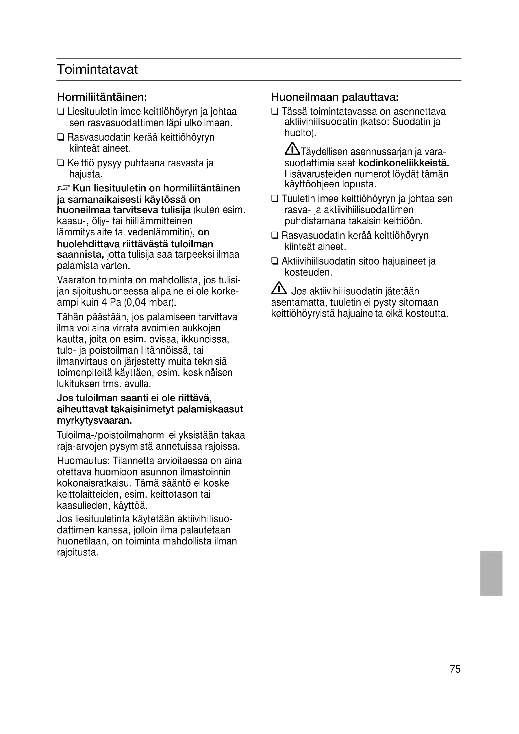 Kun liesituuletin on hormiliitäntäinen ja samanaikaisesti käytössä on huoneilmaa tarvitseva tulisija (kuten esim. kaasu-, öljy- tai hiililämmitteinen lämmityslaite tai vedenlämmitin), on huolehdittava riittävästä tuloilman saannista, jotta tulisija saa tarpeeksi ilmaa palamista varten. Vaaraton toiminta on mahdollista, jos tulisi- jan sijoitushuoneessa alipaine ei ole korke- ampi kuin 4 Pa (0,04 mbar). Tähän päästään, jos palamiseen tarvittava ilma voi aina virrata avoimien aukkojen kautta, joita on esim. ovissa, ikkunoissa, tulo- ja poistoilman liitännöissä, tai ilmanvirtaus on järjestetty muita teknisiä toimenpiteitä käyttäen, esim. keskinäisen lukituksen tms. avulla. Jos tuloilman saanti ei ole riittävä, aiheuttavat takaisinimetyt palamiskaasut myrkytysvaaran. Tuloilma-/poistoilmahormi ei yksistään takaa raja-arvojen pysymistä annetuissa rajoissa. Huomautus: Tilannetta arvioitaessa on aina otettava huomioon asunnon ilmastoinnin kokonaisratkaisu. Tämä sääntö ei koske keittolaitteiden, esim. keittotason tai kaasulieden, käyttöä. Jos liesituuletinta käytetään aktiivihiilisuo- dattimen kanssa, jolloin ilma palautetaan huonetilaan, on toiminta mahdollista ilman rajoitusta. Huoneilmaan palauttava: ❑ Tässä toimintatavassa on asennettava aktiivihiilisuodatin (katso: Suodatin ja huolto). Täydellisen asennussarjan ja vara- suodattimia saat kodinkoneliikkeistä. Lisävarusteiden numerot löydät tämän käyttöohjeen lopusta. ❑ Tuuletin imee keittiöhöyryn ja johtaa sen rasva- ja aktiivihiilisuodattimen puhdistamana takaisin keittiöön. ❑ Rasvasuodatin kerää keittiöhöyryn kiinteät aineet. ❑ Aktiivihiilisuodatin sitoo hajuaineet ja kosteuden. Jos aktiivihiilisuodatin jätetään asentamatta, tuuletin ei pysty sitomaan keittiöhöyryistä hajuaineita eikä kosteutta.76 Ennen ensimmäistä käyttöä Tärkeitä ohjeita: ❑ Tämä käyttöohje on tarkoitettu eri mallille. Tästä johtuen on mahdollista, että kaikki tässä kuvatut ominaisuudet ja varusteet eivät koske hankkimaasi laitetta. ❑ Tämä liesituuletin vastaa sähkölaitteita koskevia turvallisuusohjeita. Korjauksia saa suorittaa vain alan ammattimies. Ammattitaidottomasti tehdyt korjaukset voivat aiheuttaa laitteen käyttäjälle suuria vaaroja. ❑ Lue huolellisesti käyttöohjeet, ennen kuin käytät uutta laitetta. Niissä on tärkeää turvallisuuteen ja käyttöön liittyvää tietoa sekä laitteen hoito-ohjeita. ❑ Säilytä hyvin käyttö- ja asennusohjeet, jotta laitteen mahdollinen uusi omistaja voi tutustua niihin. Kaasulla toimivat keittotasot / liedet Paloturvallisuuden ja palovammojen ehkäisemisen vuoksi älä käytä kaikkia kaasulla toimivia keittoalueita samanaikaisesti maksimiteholla pidemmän aikaa (max. 15 minuuttia). Kun liesituuletin on asennettu kaasulla toimivan keittotason yläpuolelle, kytke liesituuletin maksimiteholle, jos käytät samanaikaisesti vähintään kolmea kaasulla toimivaa keittoaluetta. ❑ Tämän laitteen merkintä perustuu käytettyjä sähkö- ja elektroniikkalaitteita (waste electrical and electronic equipment – WEEE) koskevaan direktiiviin 2002/96/EG. Tämä direktiivi määrittää käytettyjen laitteiden palautus- ja kierrätys-säännökset koko EU:n alueella.
