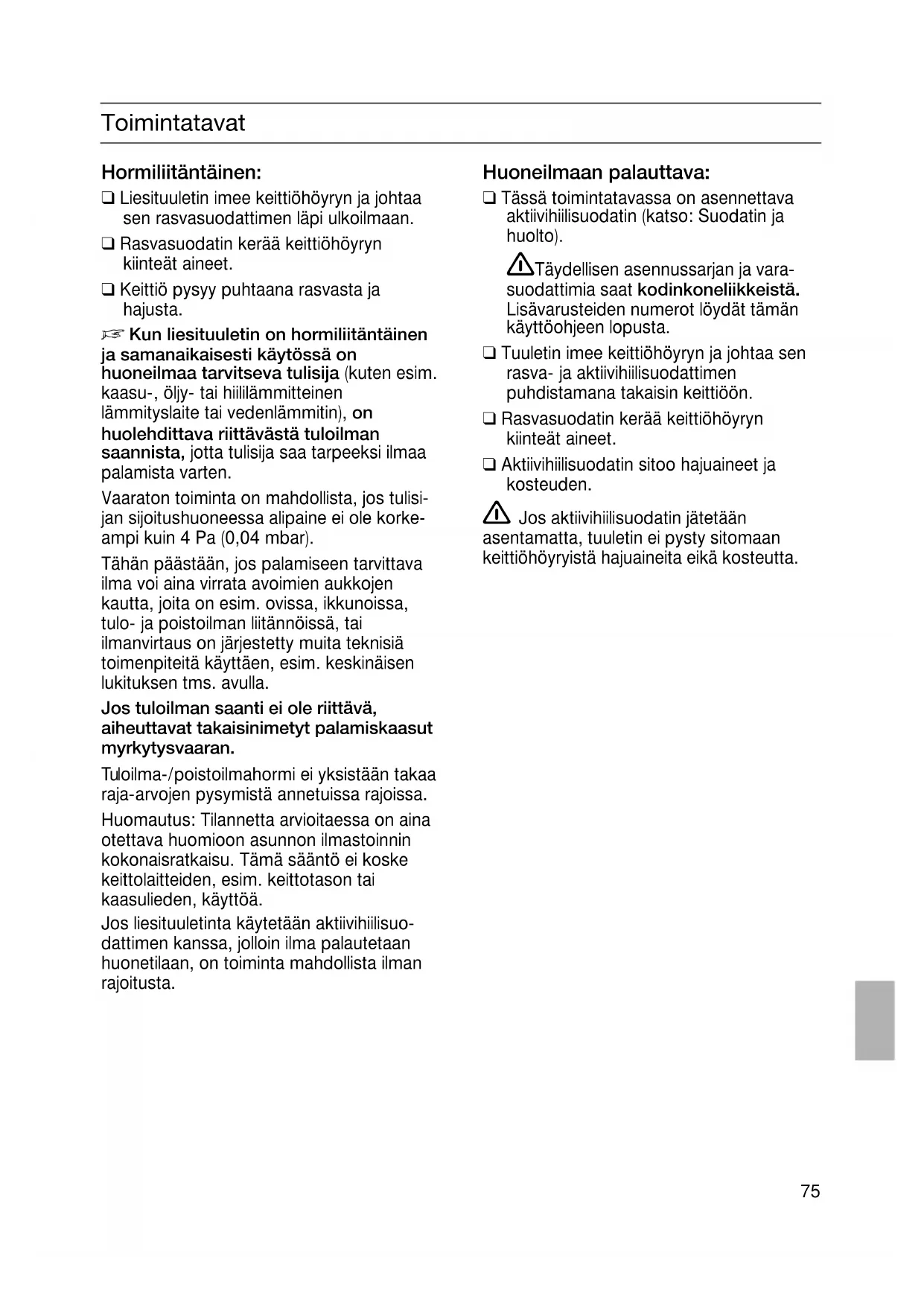 Kun liesituuletin on hormiliitäntäinen ja samanaikaisesti käytössä on huoneilmaa tarvitseva tulisija (kuten esim. kaasu-, öljy- tai hiililämmitteinen lämmityslaite tai vedenlämmitin), on huolehdittava riittävästä tuloilman saannista, jotta tulisija saa tarpeeksi ilmaa palamista varten. Vaaraton toiminta on mahdollista, jos tulisi- jan sijoitushuoneessa alipaine ei ole korke- ampi kuin 4 Pa (0,04 mbar). Tähän päästään, jos palamiseen tarvittava ilma voi aina virrata avoimien aukkojen kautta, joita on esim. ovissa, ikkunoissa, tulo- ja poistoilman liitännöissä, tai ilmanvirtaus on järjestetty muita teknisiä toimenpiteitä käyttäen, esim. keskinäisen lukituksen tms. avulla. Jos tuloilman saanti ei ole riittävä, aiheuttavat takaisinimetyt palamiskaasut myrkytysvaaran. Tuloilma-/poistoilmahormi ei yksistään takaa raja-arvojen pysymistä annetuissa rajoissa. Huomautus: Tilannetta arvioitaessa on aina otettava huomioon asunnon ilmastoinnin kokonaisratkaisu. Tämä sääntö ei koske keittolaitteiden, esim. keittotason tai kaasulieden, käyttöä. Jos liesituuletinta käytetään aktiivihiilisuo- dattimen kanssa, jolloin ilma palautetaan huonetilaan, on toiminta mahdollista ilman rajoitusta. Huoneilmaan palauttava: ❑ Tässä toimintatavassa on asennettava aktiivihiilisuodatin (katso: Suodatin ja huolto). Täydellisen asennussarjan ja vara- suodattimia saat kodinkoneliikkeistä. Lisävarusteiden numerot löydät tämän käyttöohjeen lopusta. ❑ Tuuletin imee keittiöhöyryn ja johtaa sen rasva- ja aktiivihiilisuodattimen puhdistamana takaisin keittiöön. ❑ Rasvasuodatin kerää keittiöhöyryn kiinteät aineet. ❑ Aktiivihiilisuodatin sitoo hajuaineet ja kosteuden. Jos aktiivihiilisuodatin jätetään asentamatta, tuuletin ei pysty sitomaan keittiöhöyryistä hajuaineita eikä kosteutta.76 Ennen ensimmäistä käyttöä Tärkeitä ohjeita: ❑ Tämä käyttöohje on tarkoitettu eri mallille. Tästä johtuen on mahdollista, että kaikki tässä kuvatut ominaisuudet ja varusteet eivät koske hankkimaasi laitetta. ❑ Tämä liesituuletin vastaa sähkölaitteita koskevia turvallisuusohjeita. Korjauksia saa suorittaa vain alan ammattimies. Ammattitaidottomasti tehdyt korjaukset voivat aiheuttaa laitteen käyttäjälle suuria vaaroja. ❑ Lue huolellisesti käyttöohjeet, ennen kuin käytät uutta laitetta. Niissä on tärkeää turvallisuuteen ja käyttöön liittyvää tietoa sekä laitteen hoito-ohjeita. ❑ Säilytä hyvin käyttö- ja asennusohjeet, jotta laitteen mahdollinen uusi omistaja voi tutustua niihin. Kaasulla toimivat keittotasot / liedet Paloturvallisuuden ja palovammojen ehkäisemisen vuoksi älä käytä kaikkia kaasulla toimivia keittoalueita samanaikaisesti maksimiteholla pidemmän aikaa (max. 15 minuuttia). Kun liesituuletin on asennettu kaasulla toimivan keittotason yläpuolelle, kytke liesituuletin maksimiteholle, jos käytät samanaikaisesti vähintään kolmea kaasulla toimivaa keittoaluetta. ❑ Tämän laitteen merkintä perustuu käytettyjä sähkö- ja elektroniikkalaitteita (waste electrical and electronic equipment – WEEE) koskevaan direktiiviin 2002/96/EG. Tämä direktiivi määrittää käytettyjen laitteiden palautus- ja kierrätys-säännökset koko EU:n alueella.