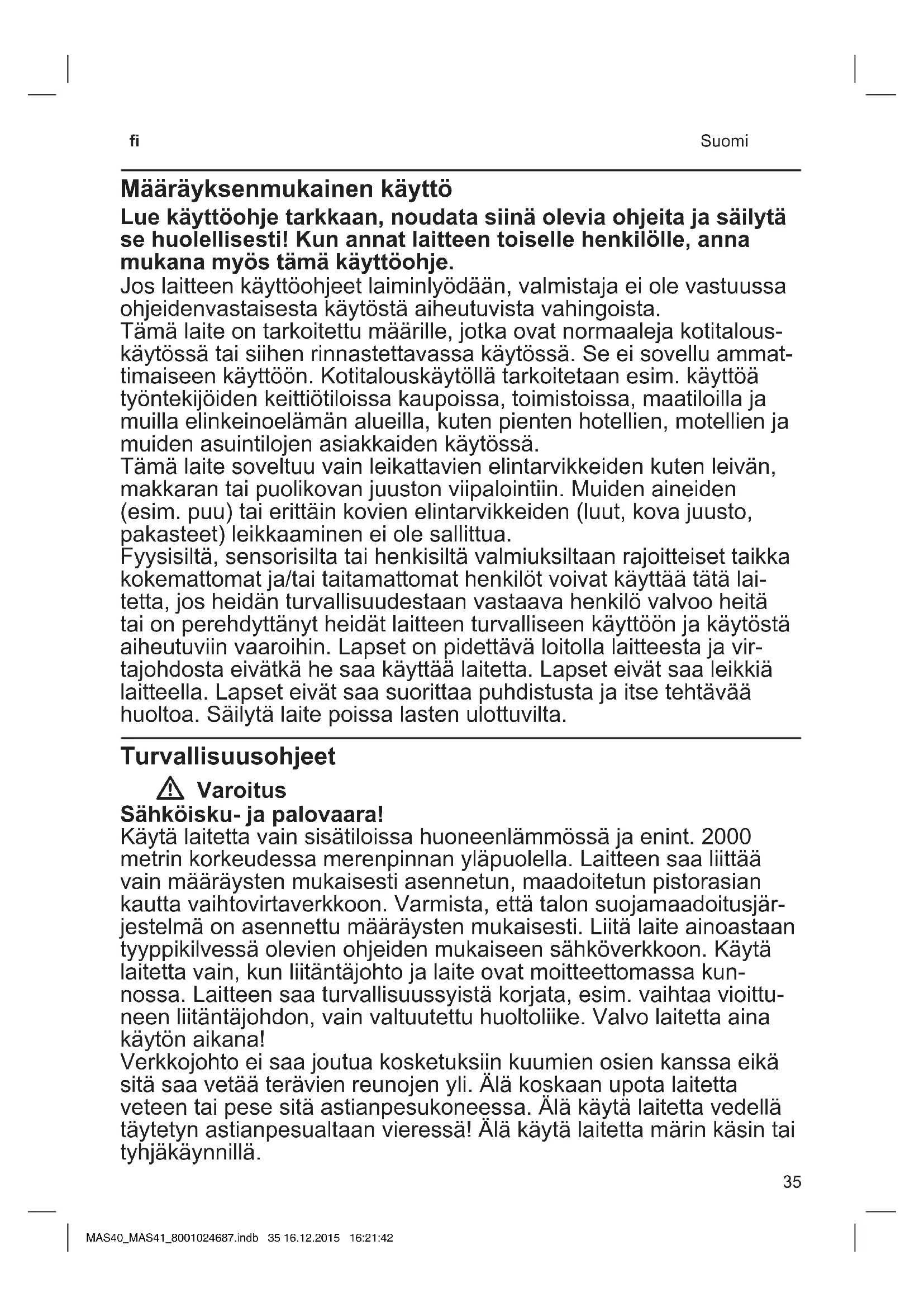 - Takuu Laiteonirrotettavaverkkovirrastaaina,kunsenkäyttölopetetaan, sitäeivoidavalvoa,ennensenkokoamista,purkamistataipuhdis- tustasekähäiriötilanteissa.Katkaiselaitteestavirtajairrotasesäh- kövirrasta,ennenkuinvaihdatvarusteitatailisäosia,jotkaliikkuvat laitteenollessatoiminnassa. W Varoitus Loukkaantumisvaara Teräonhyvinterävä.Pidäkädetpoissateränläheisyydestä.Kone käyvieläjonkinaikaapysäyttämisenjälkeen.Odota,kunnesterä pysähtyykokonaan!Asetakäytönjälkeenviipalointivahvuudeksi0. Käytälaitettakelkanjajäännöspalanpitimenkanssakäyttöasen- nossa,paitsijosviipaloitavienelintarvikkeidenkokojamuotoeisalli niidenkäyttöä. Irrotaverkkopistokepistorasiastajateräleikkuristaennenpuhdista- mista.Älätartuteräänsenleikkauspinnalta,vaanotakiinniainoas- taanteränpitimestä.Sähkökatkonsattuessaleikkurieikytkeydypois päältä.Sekäynnistyyhetisähköjenkytkeydyttyätaaspäälle. W Huomio Moottorivoiylikuumentua!Kunleikkurionollutkeskeytyksettä toiminnassaenint.5minuuttia,annasenjäähtyä. W Varoitus Tukehtumisvaara Äläannalastenleikkiäpakkausmateriaalilla. MAS40_MAS41_8001024687.indb 36 16.12.2015 16:21:42 37 p. 38