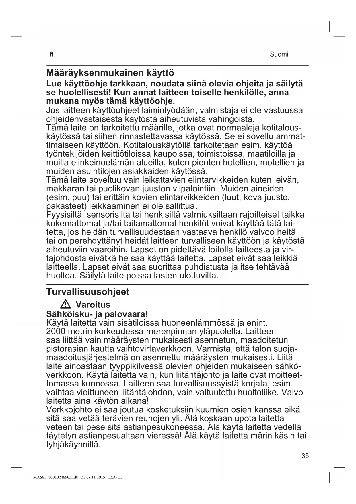 - Takuu Laiteonirrotettavaverkkovirrastaaina,kunsenkäyttölopetetaan, sitäeivoidavalvoa,ennensenkokoamista,purkamistataipuhdis- tustasekähäiriötilanteissa.Katkaiselaitteestavirtajairrotasesäh- kövirrasta,ennenkuinvaihdatvarusteitatailisäosia,jotkaliikkuvat laitteenollessatoiminnassa. W Varoitus Loukkaantumisvaara Teräonhyvinterävä.Pidäkädetpoissateränläheisyydestä.Kone käyvieläjonkinaikaapysäyttämisenjälkeen.Odota,kunnesterä pysähtyykokonaan!Asetakäytönjälkeenviipalointivahvuudeksi0. Käytälaitettakelkanjajäännöspalanpitimenkanssakäyttöasen- nossa,paitsijosviipaloitavienelintarvikkeidenkokojamuotoeisalli niidenkäyttöä. Irrotaverkkopistokepistorasiastajateräleikkuristaennenpuhdista- mista.Älätartuteräänsenleikkauspinnalta,vaanotakiinniainoas- taanteränpitimestä.Sähkökatkonsattuessaleikkurieikytkeydypois päältä.Sekäynnistyyhetisähköjenkytkeydyttyätaaspäälle. W Huomio Moottorivoiylikuumentua!Kunleikkurionollutkeskeytyksettä toiminnassaenint.10minuuttia,annasenjäähtyä. W Varoitus Tukehtumisvaara Äläannalastenleikkiäpakkausmateriaalilla. MAS61_8001024690.indb 36 09.11.2015 12:35:33 37 p. 38