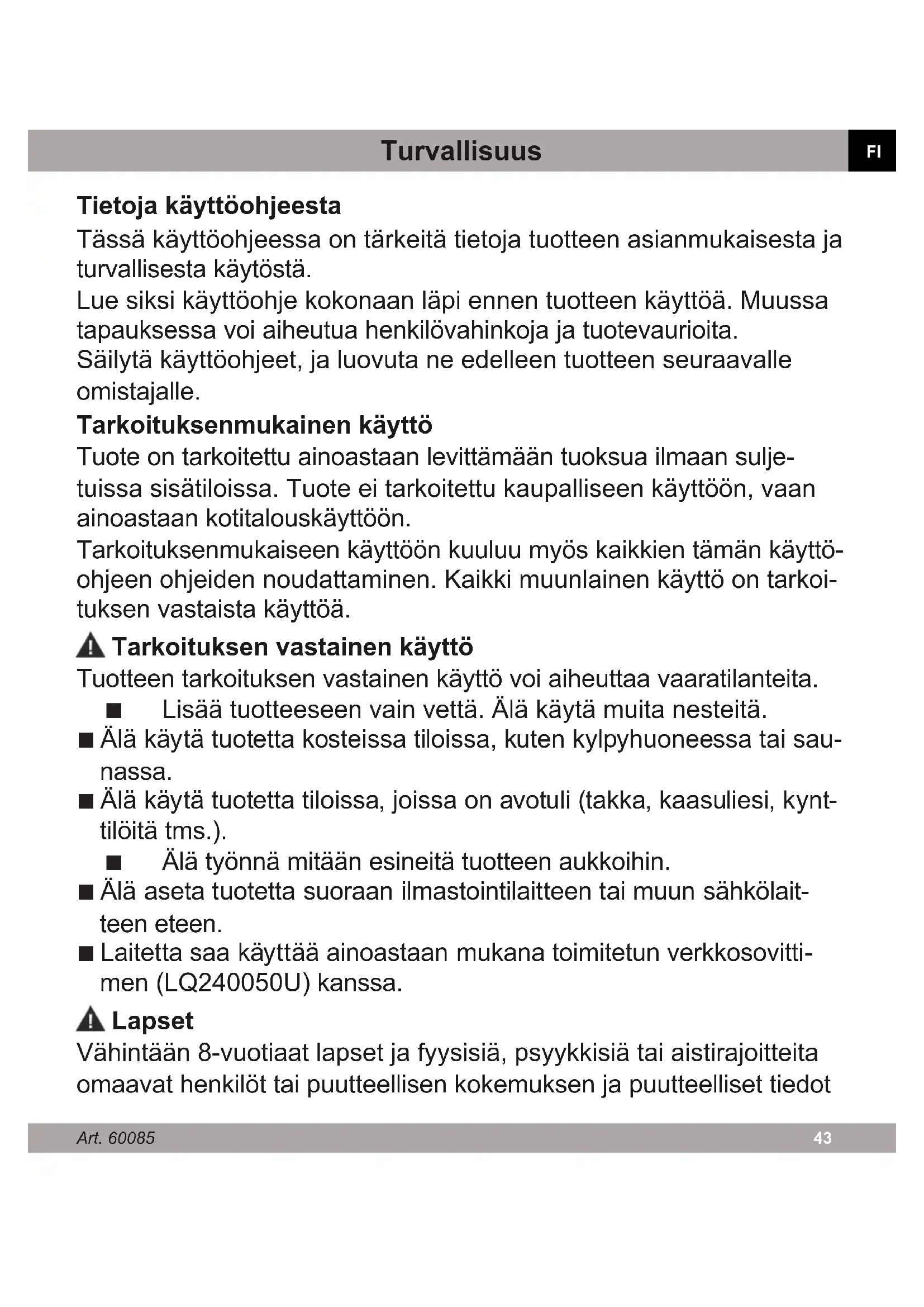 Tuote on tarkoitettu ainoastaan levittämään tuoksua ilmaan suljetuissa sisätiloissa. Tuote ei tarkoitettu kaupalliseen käyttoön, vaan ainoastaan kotitalouskäyttoön.