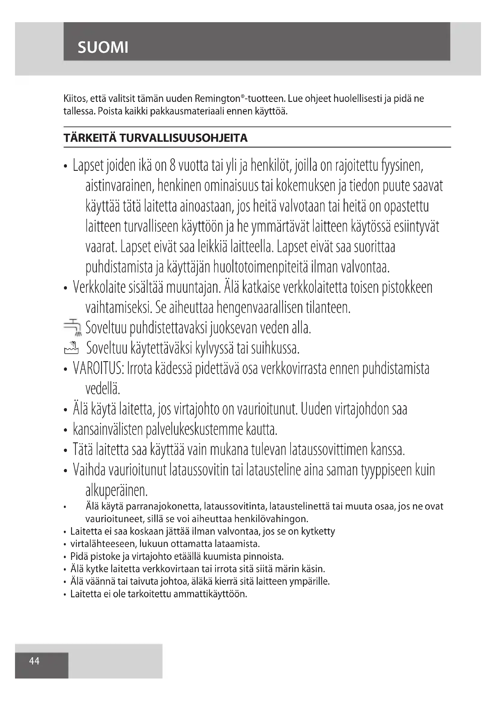 - Lapset joiden ikä on 8 vuotta tai yli ja henkilöt, joilla on rajoitettu fyysinen, aistinvarainen, henkinen ominaisuus tai kokemuksen ja tiedon puute saavat käyttää tätä laitetta ainoastaan, jos heitä valvotaan tai heitä on opastettu laitteen turvalliseen käyttöön ja he ymmärtävät laitteen käytössä esiintyvät vaarat. Lapset eivät saa leikkiä laitteella. Lapset eivät saa suorittaa puhdistamista ja käyttäjän huoltotoimenpiteitä ilman valvontaa.