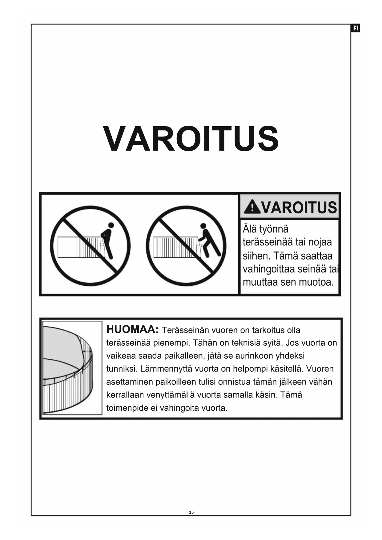 10 cm #04 #0835 Älä työnnä terässeinää tai nojaa siihen. Tämä saattaa vahingoittaa seinää tai muuttaa sen muotoa. HUOMAA: Terässeinän vuoren on tarkoitus olla terässeinää pienempi. Tähän on teknisiä syitä. Jos vuorta on vaikeaa saada paikalleen, jätä se aurinkoon yhdeksi tunniksi. Lämmennyttä vuorta on helpompi käsitellä. Vuoren asettaminen paikoilleen tulisi onnistua tämän jälkeen vähän kerrallaan venyttämällä vuorta samalla käsin. Tämä toimenpide ei vahingoita vuorta. VAROITUS VAROITUS FI36 ÄLÄ PALAUTA TUOTETTALIIKKEESEENKYSYMYKSIÄ? ONGELMIA?OSIA PUUTTUU?Löydät usein kysyttyjä kysymyksiä, käyttöoppaitavideoita ja varosia osoitteessa bestwaycorp.com/support