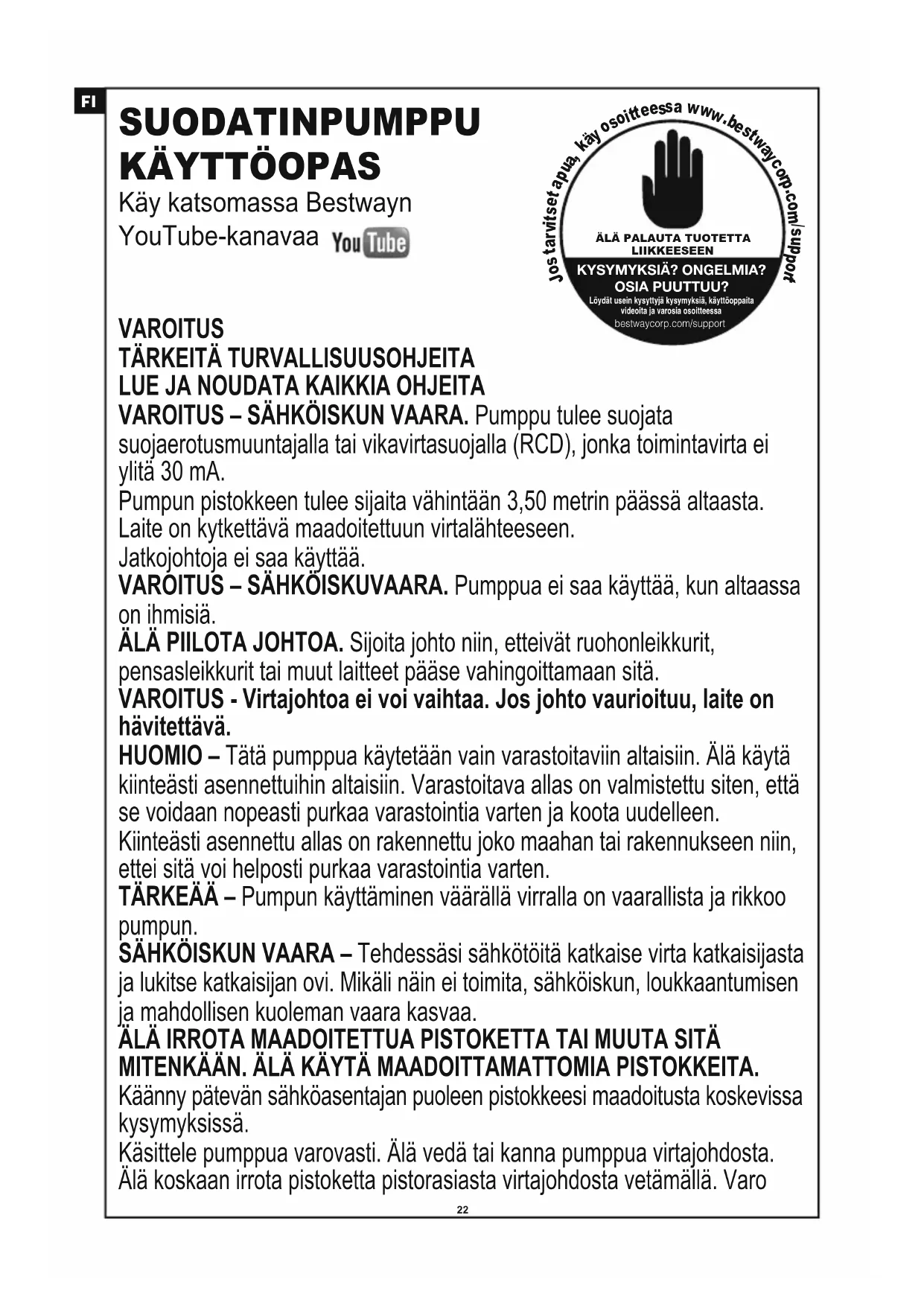 - Jätä vartioimatta lomakausien ajaksi Ohjeiden säilytys. Joka kerta kun kokoat altaan uudestaan, lue aina ohjeet. Jos ohjeet puuttuvat, ota yhteyttä Bestwayhin tai hae ne verkkosivustolta: www.bestwaycorp.com. MUISTUTUS: Tätä tuotetta ei ole tarkoitettu kaupalliseen käyttöön. Lue käyttöohje huolellisesti ja säilytä mahdollista tulevaa tarvetta varten. SÄILYTÄ NÄMÄ OHJEET. SUODATINPUMPPU