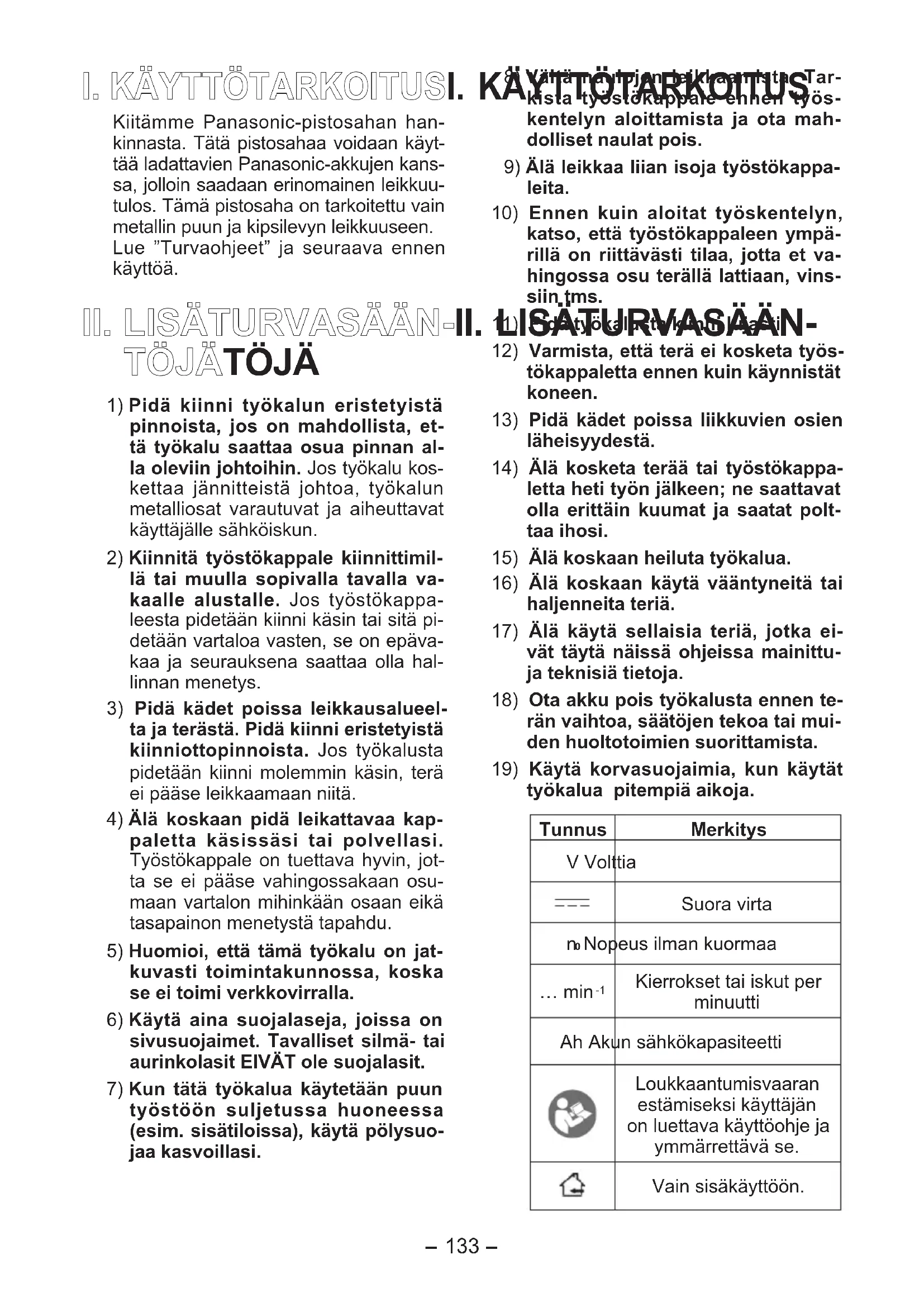 VAROITUS: Älä käytä muita kuin Panasonicin tä- hän ladattavaan tuotteeseen suunni- teltuja akkusarjoja. Älä hävitä akkua polttamalla tai altista sitä suurelle kuumuudelle. Älä lyö nauloja akkuun, altista sitä is- kuille, pura sitä tai yritä muuntaa sitä. Älä anna metalliesineiden koskettaa akun napoja. Älä kuljeta tai säilytä akkua samassa tilassa naulojen ja vastaavien metal- liesineiden kanssa. Älä lataa akkua kuumassa tilassa esim. tulen äärellä tai suorassa aurin- gonvalossa. Muussa tapauksessa ak- ku voi ylikuumentua, syttyä tuleen tai räjähtää. Käytä vain laitteen omaa laturia akun lataamiseen. Muussa tapauksessa ak- ku voi vuotaa ylikuumentua tai räjäh- tää. Kun akku on irrotettu työkalusta tai la- turista, pane aina akun kansi paikal- leen. Muuten akun liittimet saattavat mennä oikosulkuun, jolloin seuraukse- na on tulipalovaara.