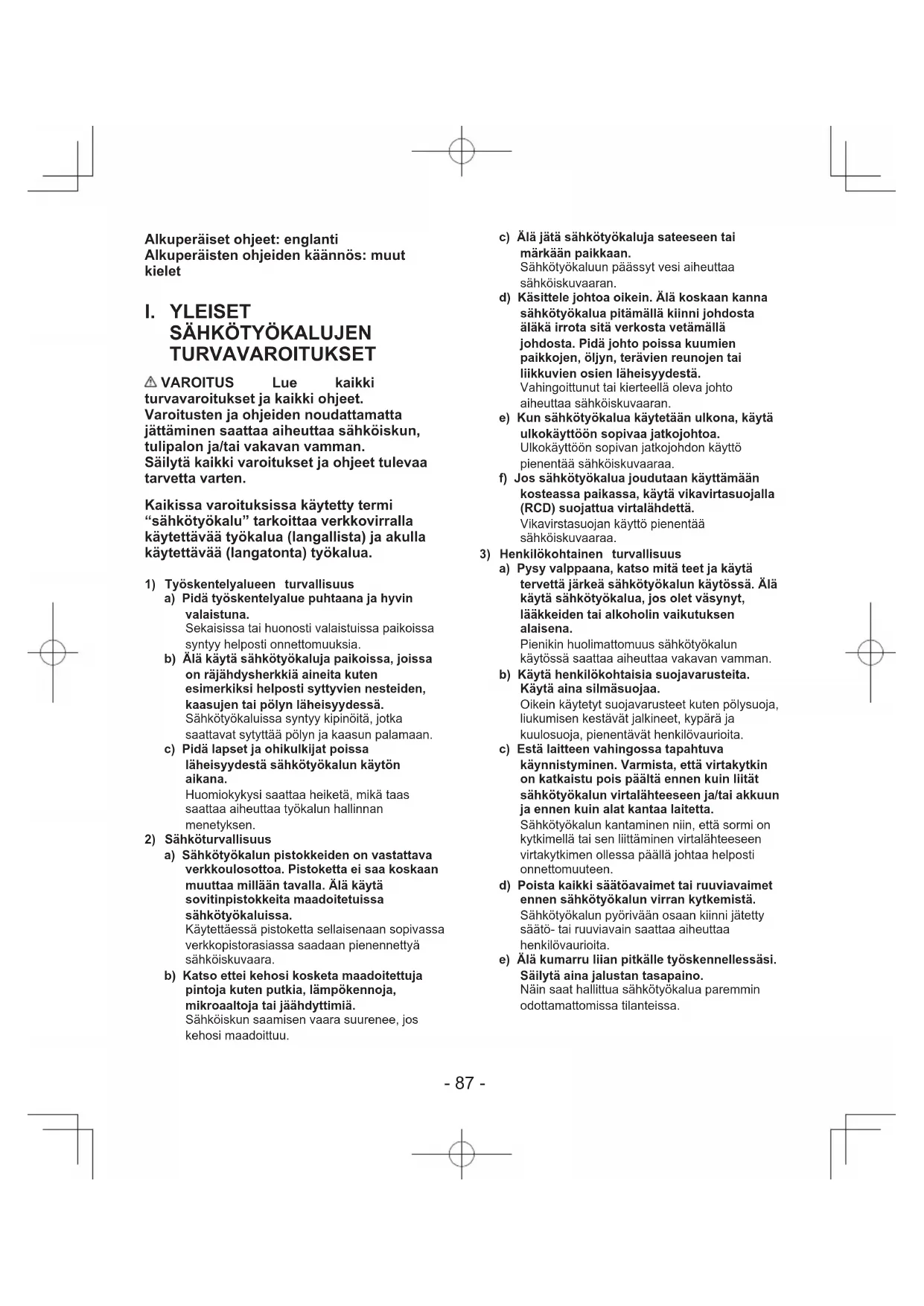 TURVAVAROITUKSET VAROITUS Lue kaikki turvavaroitukset ja kaikki ohjeet. Varoitusten ja ohjeiden noudattamatta jättäminen saattaa aiheuttaa sähköiskun, tulipalon ja/tai vakavan vamman. Säilytä kaikki varoitukset ja ohjeet tulevaa tarvetta varten. Kaikissa varoituksissa käytetty termi “sähkötyökalu” tarkoittaa verkkovirralla käytettävää työkalua (langallista) ja akulla käytettävää (langatonta) työkalua.