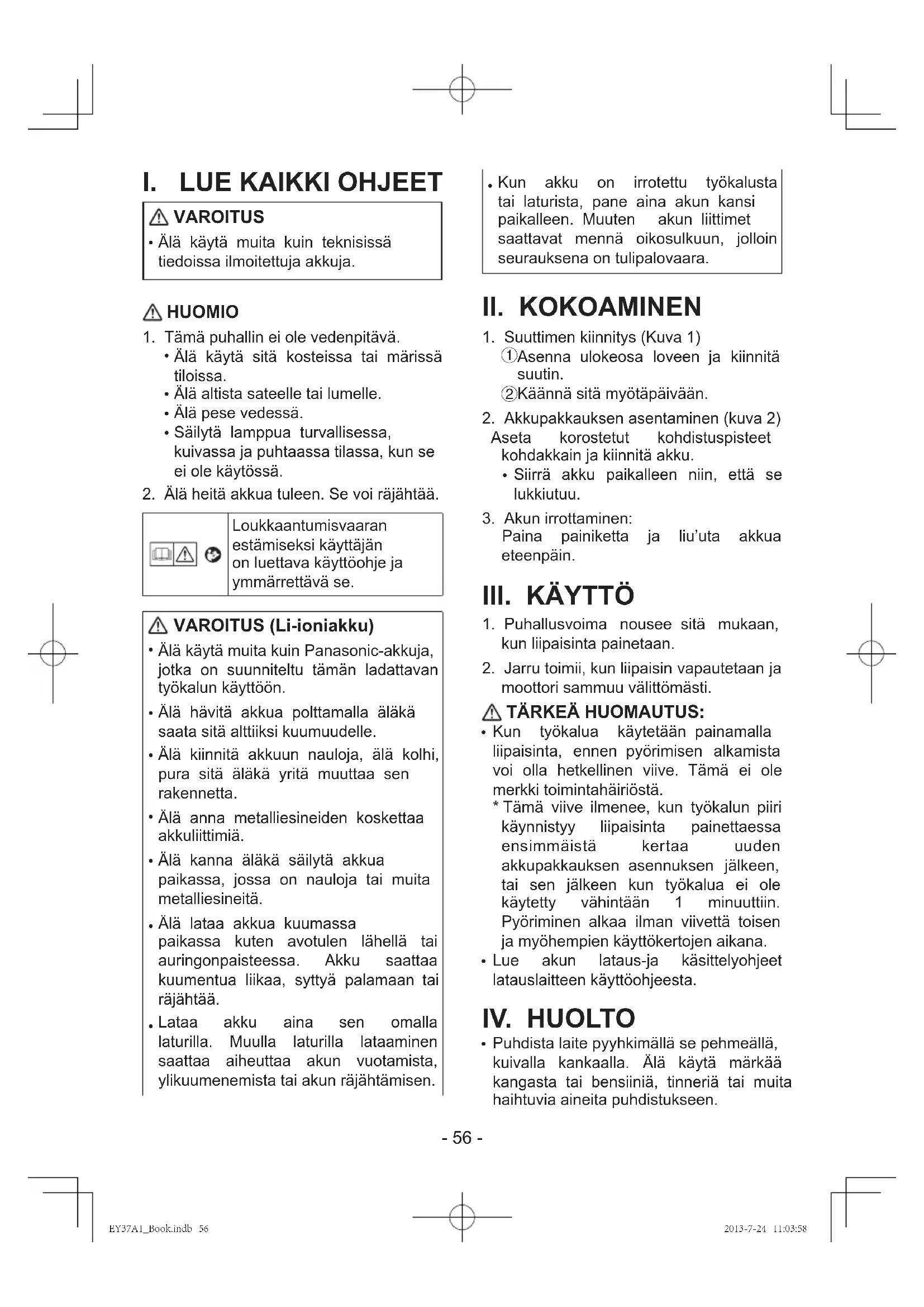 käynnistyy ja akku lakkaa toimimasta. EY37A1_Book.indb 57 2013-7-24 11:03:59- 58 - Turvallisen käytön takaamiseksi Akku on suunniteltu asennettavaksi