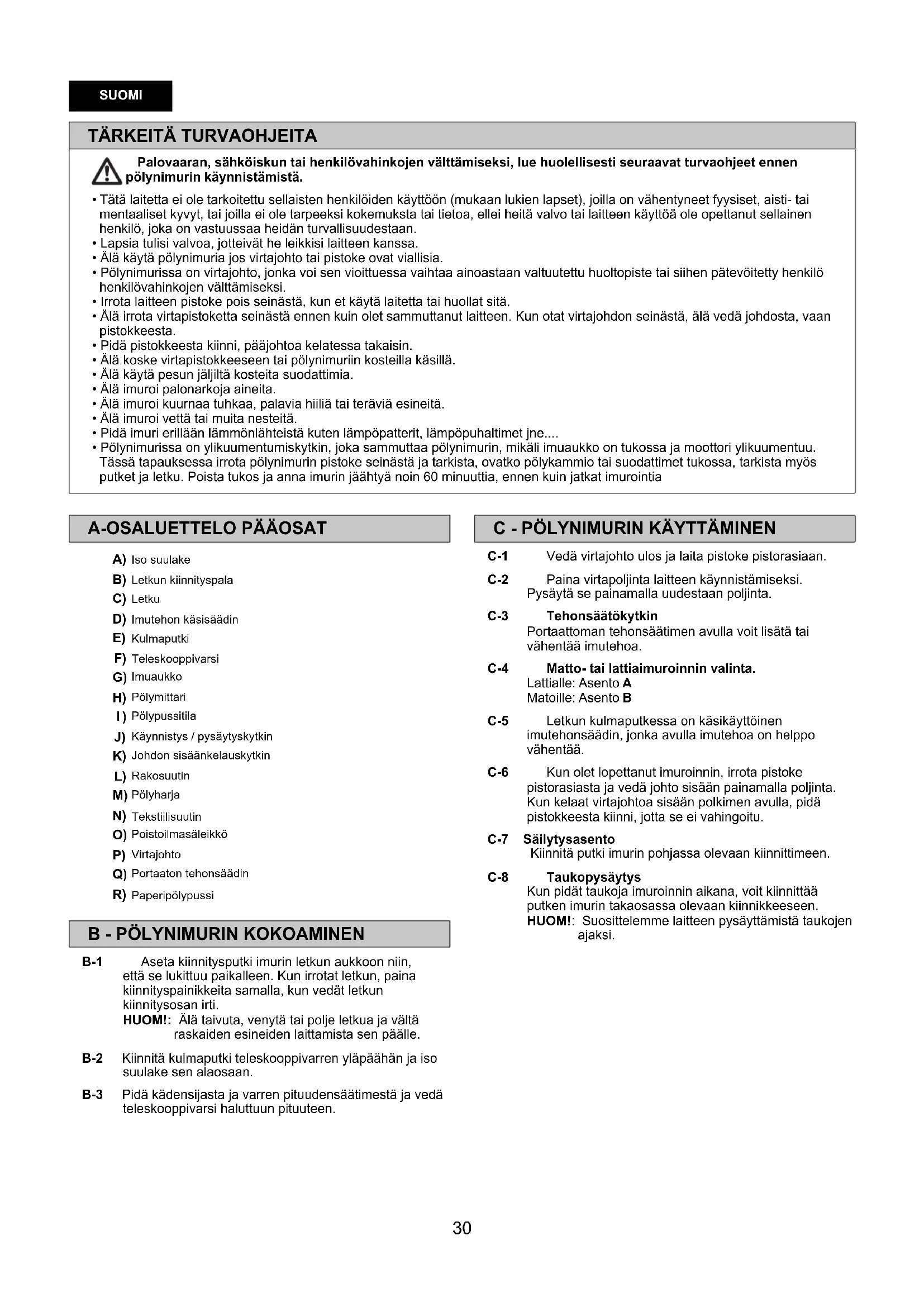 Palovaaran, sähköiskun tai henkilövahinkojen välttämiseksi, lue huolellisesti seuraavat turvaohjeet ennen pölynimurin käynnistämistä.