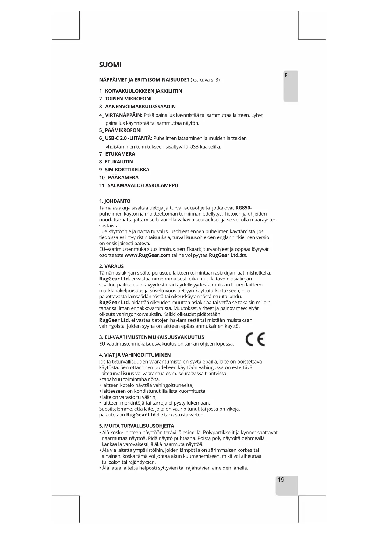Tämä asiakirja sisältää tietoja ja turvallisuusohjeita, jotka ovat RG850- puhelimen käytön ja moitteettoman toiminnan edellytys. Tietojen ja ohjeiden noudattamatta jättämisellä voi olla vakavia seurauksia, ja se voi olla määräysten vastaista. Lue käyttöohje ja nämä turvallisuusohjeet ennen puhelimen käyttämistä. Jos tiedoissa esiintyy ristiriitaisuuksia, turvallisuusohjeiden englanninkielinen versio on ensisijaisesti pätevä. EU-vaatimustenmukaisuusilmoitus, sertifikaatit, turvaohjeet ja oppaat löytyvät osoitteesta www.RugGear.com tai ne voi pyytää RugGear Ltd.:lta.