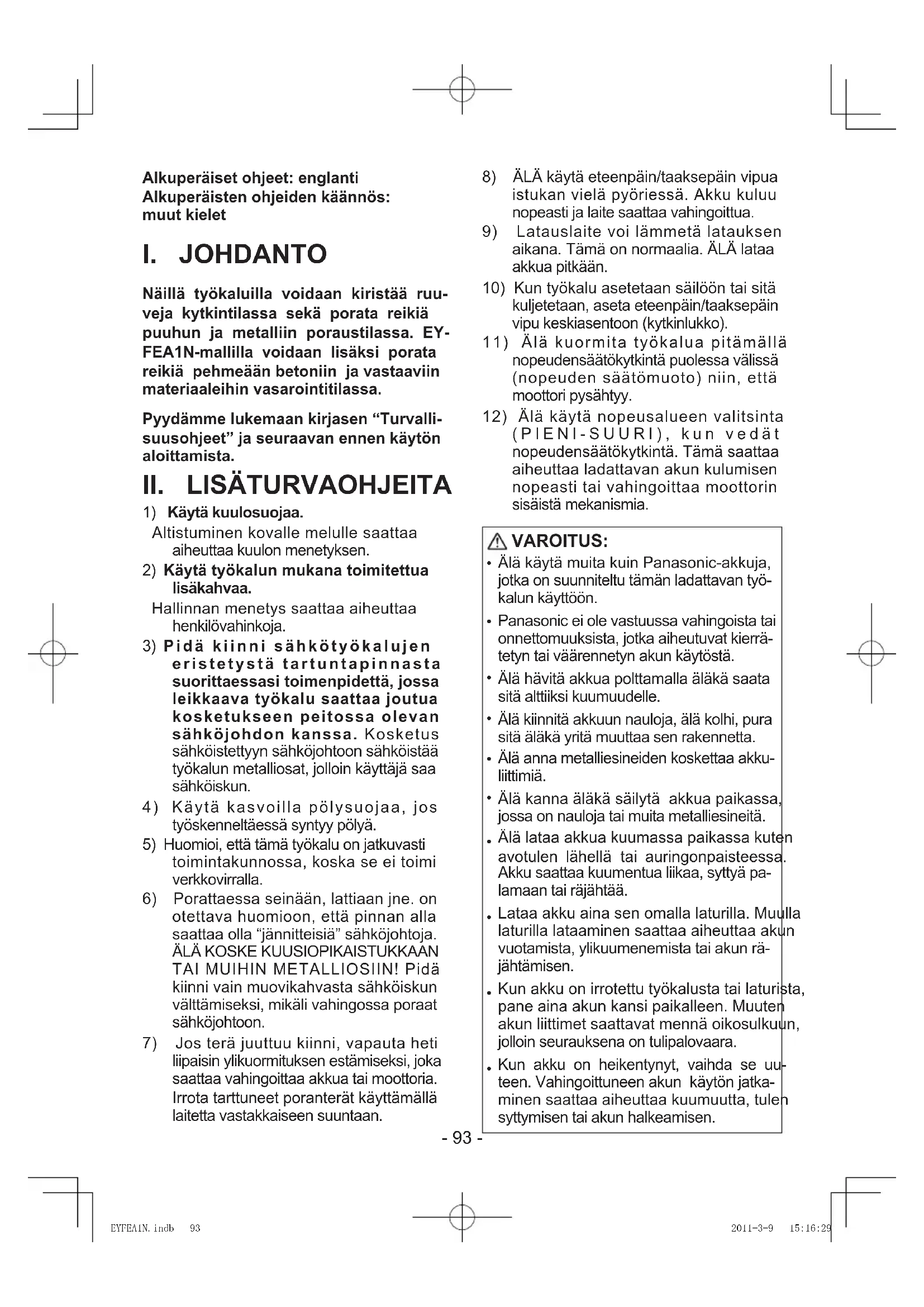 teen. Vahingoittuneen akun käytön jatka- minen saattaa aiheuttaa kuumuutta, tulen syttymisen tai akun halkeamisen. EYFEA1N.indb 93 2011-3-9 15:16:29- 94 - Tunnus MerkitysV VolttiaSuora virta