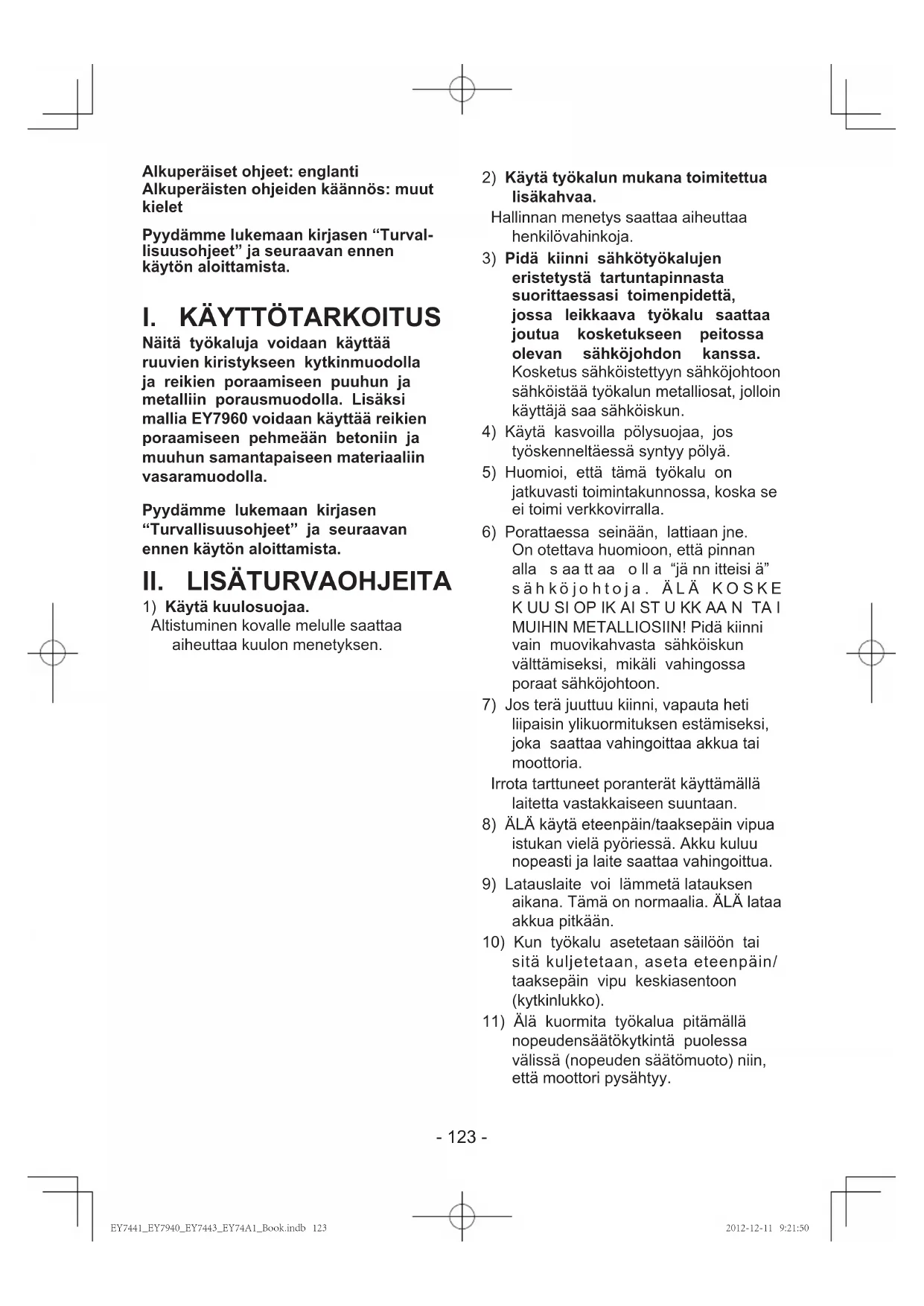 nopeudensäätökytkintä puolessa välissä (nopeuden säätömuoto) niin, että moottori pysähtyy. Alkuperäiset ohjeet: englanti Alkuperäisten ohjeiden käännös: muut kielet Pyydämme lukemaan kirjasen “Turval- lisuusohjeet” ja seuraavan ennen käytön aloittamista. EY7441_EY7940_EY7443_EY74A1_Book.indb 123 2012-12-11 9:21:50- 124 -