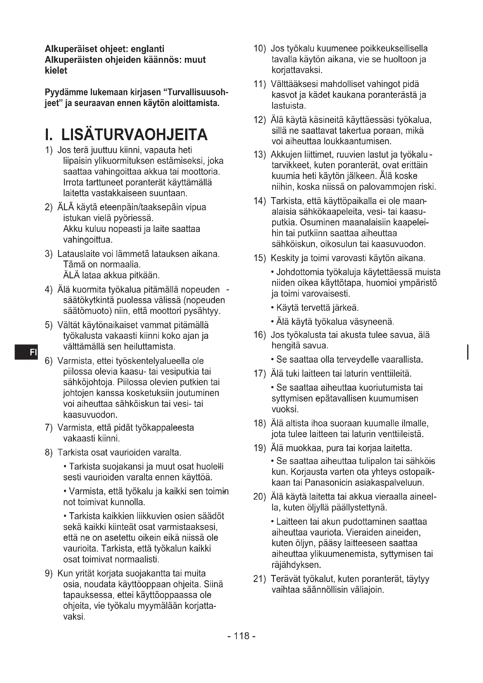 Alkuperäiset ohjeet: englanti Alkuperäisten ohjeiden käännös: muut kielet Pyydämme lukemaan kirjasen “Turvallisuusoh- jeet” ja seuraavan ennen käytön aloittamista.