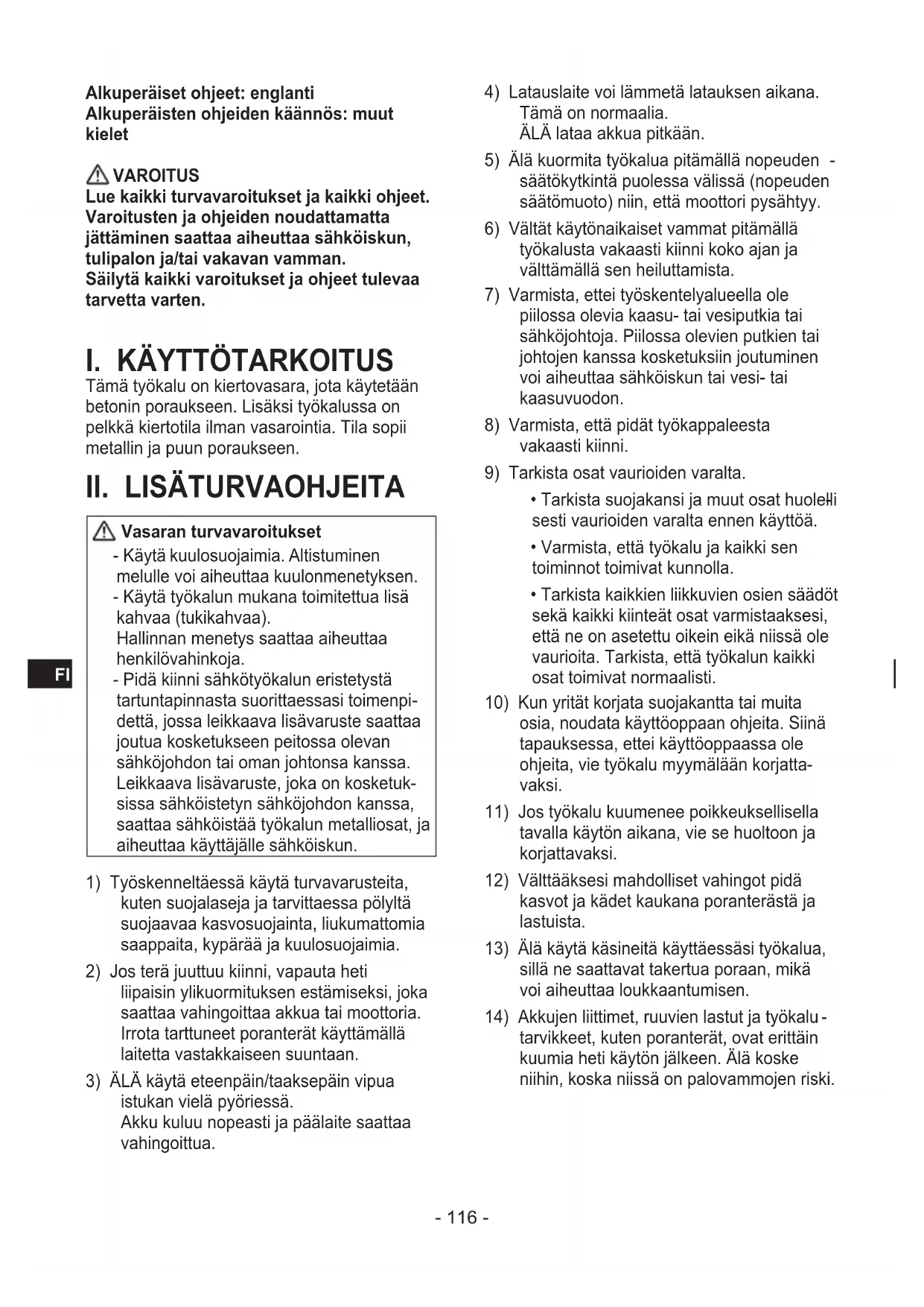 tarvikkeet, kuten poranterät, ovat erittäin kuumia heti käytön jälkeen. Älä koske niihin, koska niissä on palovammojen riski.- 117 -