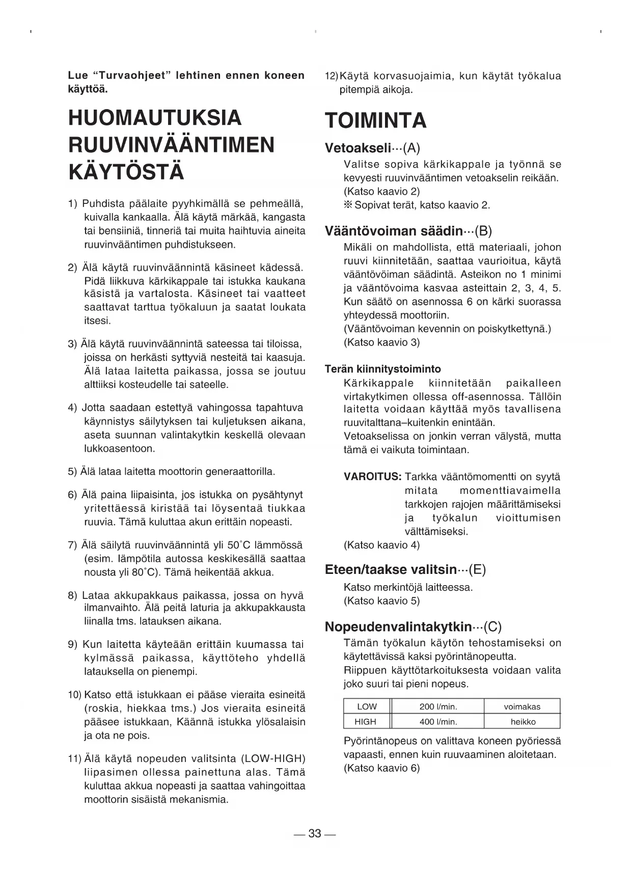 kylmässä paikassa, käyttöteho yhdellä latauksella on pienempi. 10) Katso että istukkaan ei pääse vieraita esineitä (roskia, hiekkaa tms.) Jos vieraita esineitä pääsee istukkaan, Käännä istukka ylösalaisin ja ota ne pois. 11) Älä käytä nopeuden valitsinta (LOW-HIGH) liipasimen ollessa painettuna alas. Tämä kuluttaa akkua nopeasti ja saattaa vahingoittaa moottorin sisäistä mekanismia. 12) Käytä korvasuojaimia, kun käytät työkalua pitempiä aikoja. TOIMINTA Vetoakseli···(A) Valitse sopiva kärkikappale ja työnnä se kevyesti ruuvinvääntimen vetoakselin reikään. (Katso kaavio 2)