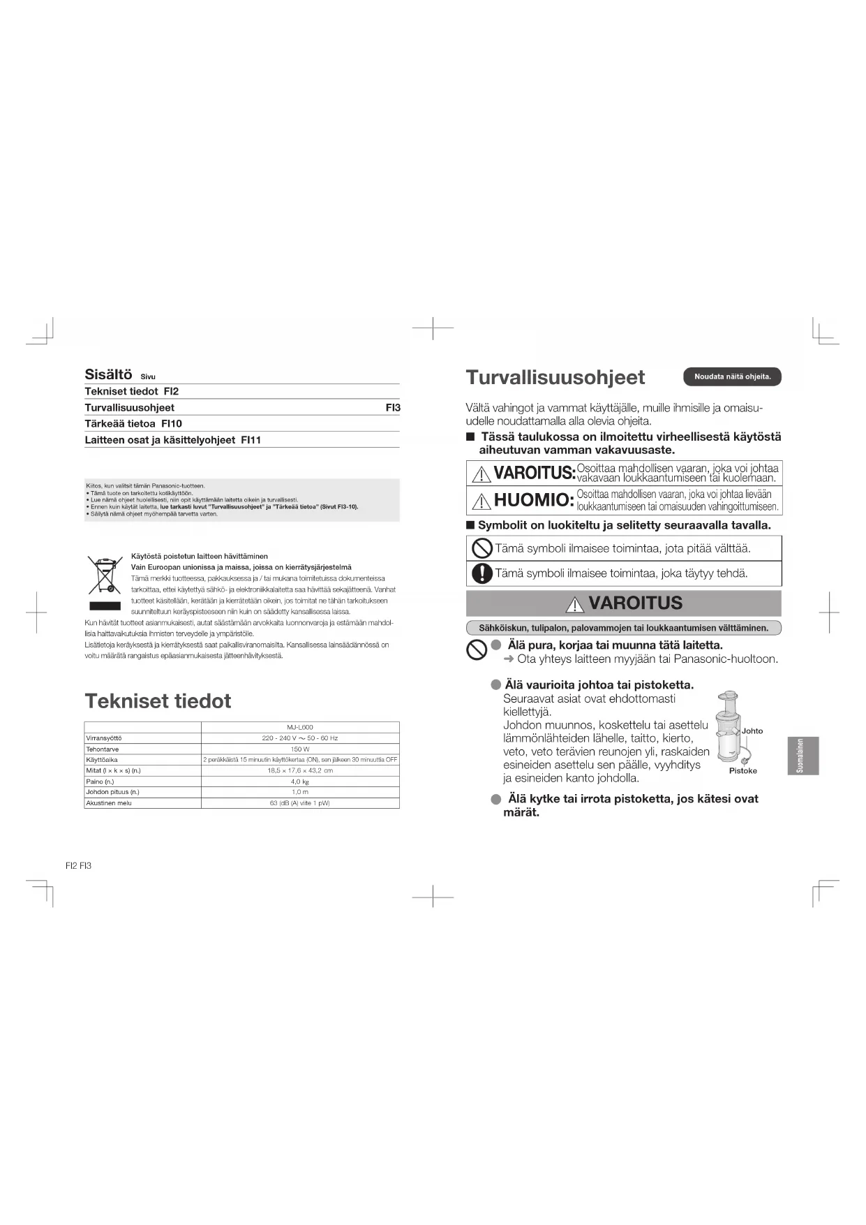 Lataa ohjeet laitteellesi Mehustin PDF-muodossa ilmaiseksi! Löydä käyttöohjeesi MJL600 - PANASONIC ja ota elektroninen laitteesi takaisin hallintaan. Tällä sivulla julkaistaan kaikki laitteidesi käyttöön tarvittavat asiakirjat. MJL600 merkiltä PANASONIC.