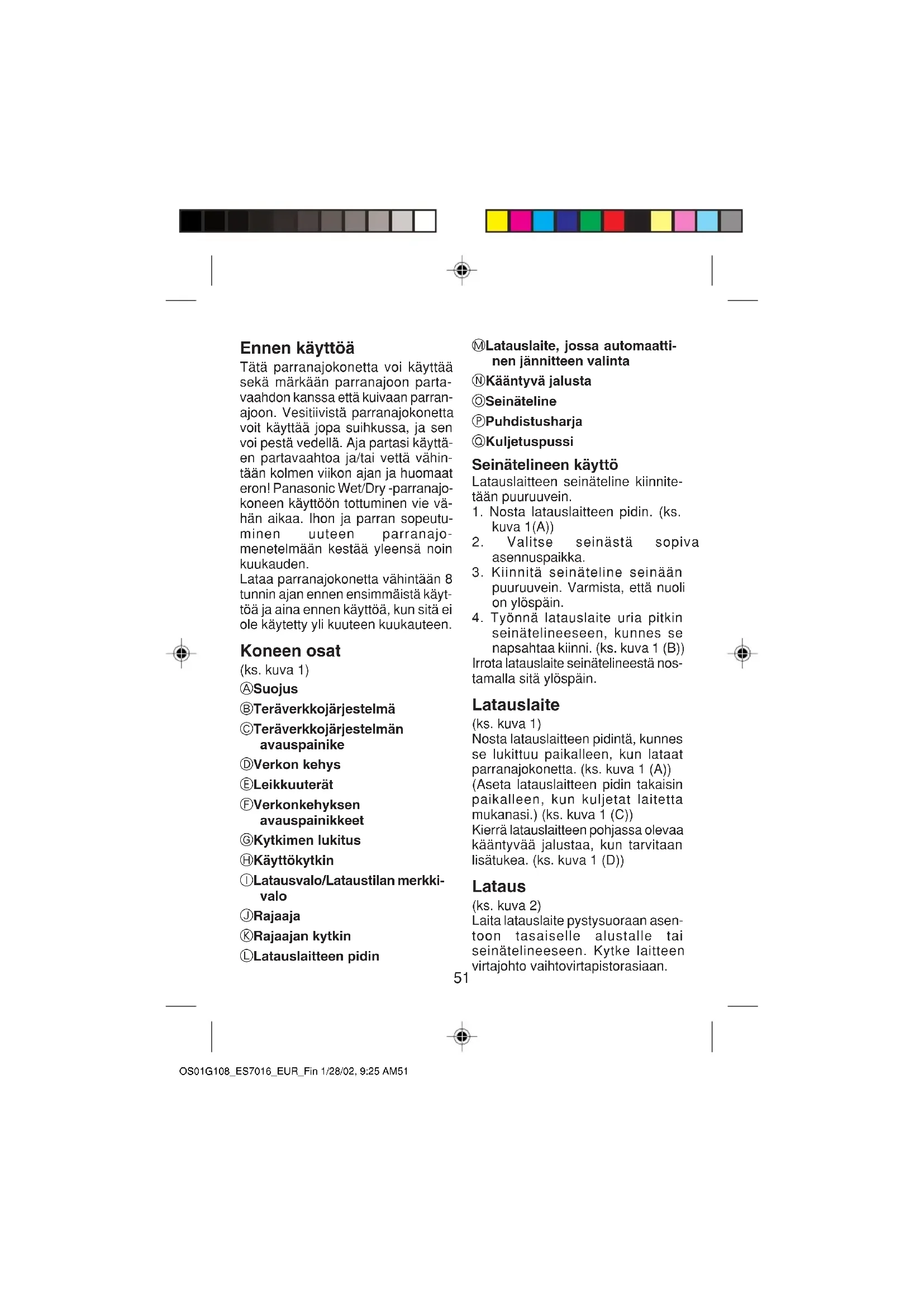 - Använd inte rakapparaten till annat än avsett ändamål, enligt beskriv- ningen i denna bruksanvisning. Denna produkt är enbart avsedd för användning i hemmet. OS01G108_ES7016_EUR_Sw 1/28/02, 9:25 AM5051 Ennen käyttöä Tätä parranajokonetta voi käyttää sekä märkään parranajoon parta- vaahdon kanssa että kuivaan parran- ajoon. Vesitiivistä parranajokonetta voit käyttää jopa suihkussa, ja sen voi pestä vedellä. Aja partasi käyttä- en partavaahtoa ja/tai vettä vähin- tään kolmen viikon ajan ja huomaat eron! Panasonic Wet/Dry -parranajo- koneen käyttöön tottuminen vie vä- hän aikaa. Ihon ja parran sopeutu- minen uuteen parranajo- menetelmään kestää yleensä noin kuukauden. Lataa parranajokonetta vähintään 8 tunnin ajan ennen ensimmäistä käyt- töä ja aina ennen käyttöä, kun sitä ei ole käytetty yli kuuteen kuukauteen. Koneen osat (ks. kuva 1) A Suojus B Teräverkkojärjestelmä C Teräverkkojärjestelmän avauspainike D Verkon kehys E Leikkuuterät F Verkonkehyksen avauspainikkeet G Kytkimen lukitus H Käyttökytkin I Latausvalo/Lataustilan merkki- valo J Rajaaja K Rajaajan kytkin L Latauslaitteen pidin M Latauslaite, jossa automaatti- nen jännitteen valinta N Kääntyvä jalusta O Seinäteline P Puhdistusharja Q Kuljetuspussi Seinätelineen käyttö Latauslaitteen seinäteline kiinnite- tään puuruuvein.
